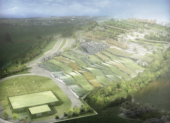 grass will be placed on the roofs of each level so that the building blends in with the green landscape appearing like a hill itself