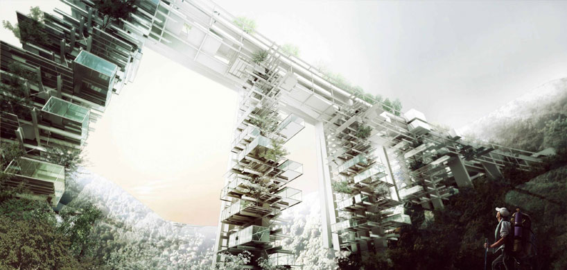 stacked and offset volumes extend along the pillars and roadway to create a harmonious combination of both the original and reincarnated typologies. accommodating both functions, the upper part of one of viaducts will house a pedestrian promenade, while the other lanes will remain dedicated to vehicular traffic. a series of public and private environments with trickle down and rotate around the structural form, that aim to integrate with the lush and natural surroundings.