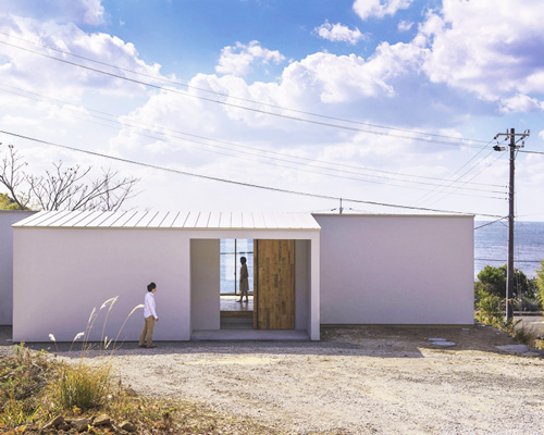 set into a hillside near the japanese resort town of shirahama, this single storey dwelling offers sweeping views of the region’s dramatic coastline. designed by okuwada architects office, the home provides linear living accommodation for a small family, with an open plan kitchen/diner adjoining a sheltered external terrace. surrounded on three sides by rugged terrain, the low-profile dwelling sits naturally within the landscape, running parallel with the distant horizon.