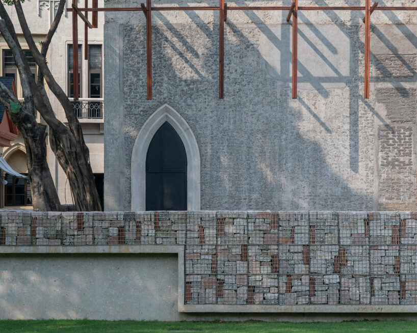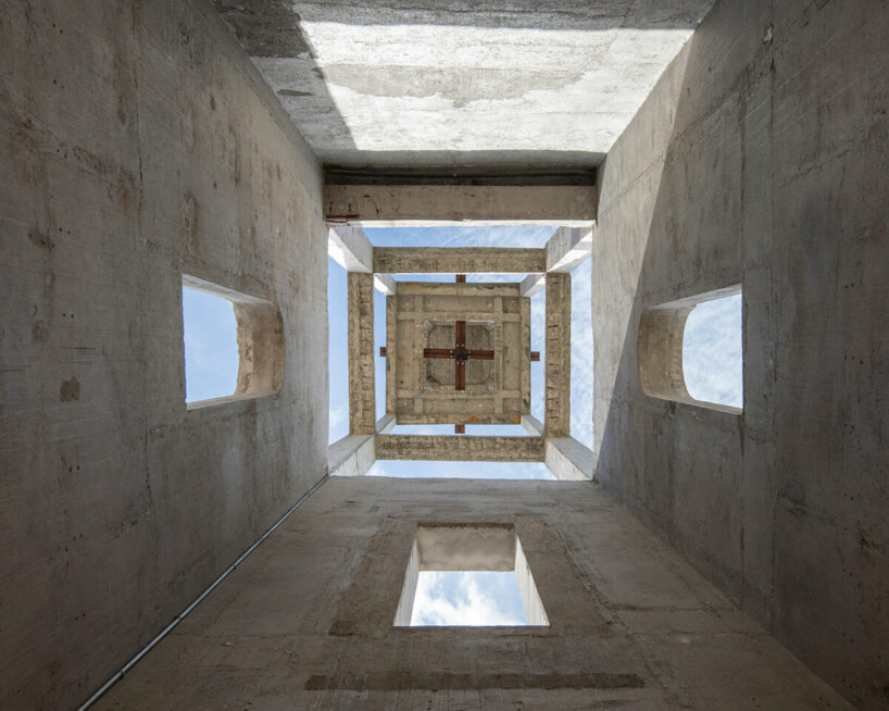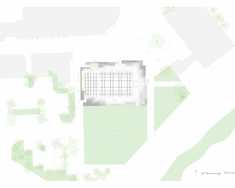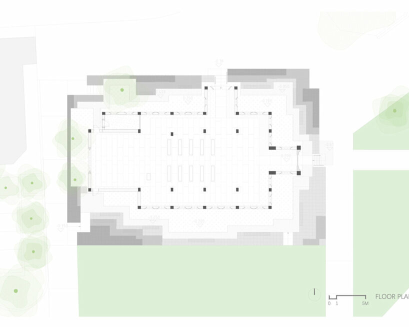 the project sits like a ring placed over the terrain, with its funnel-like roof forming a shaded perimeter walkway and an introverted core.