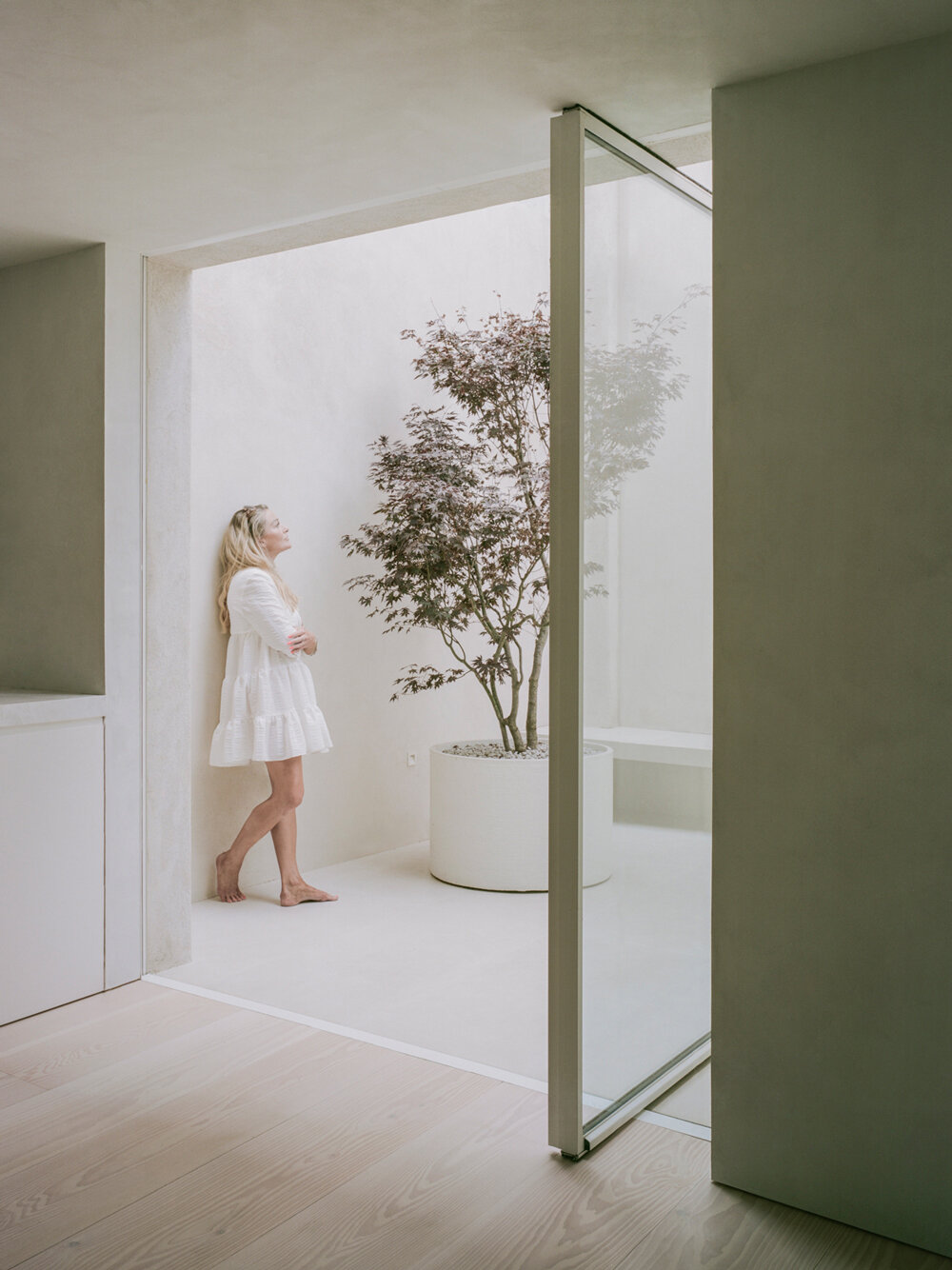 A minimal frame pivot door stretches from floor to ceiling, offering a seamless transition between the interior and the serene courtyard. This door serves as a toplit chamber, drawing abundant daylight into the rear of the property and creating a bright and inviting atmosphere. The outdoor space is organized by simple geometric forms: a sleek planar bench and an elegant cylindrical pot.
