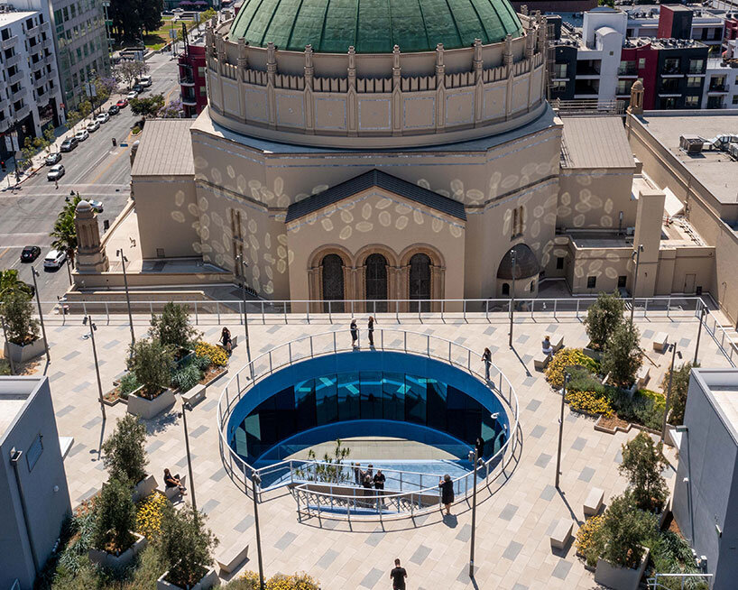 the project sits like a ring placed over the terrain, with its funnel-like roof forming a shaded perimeter walkway and an introverted core.