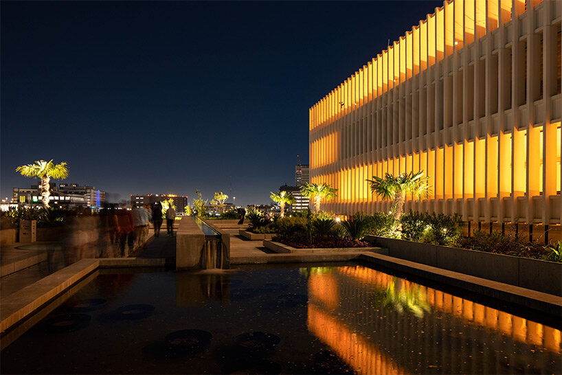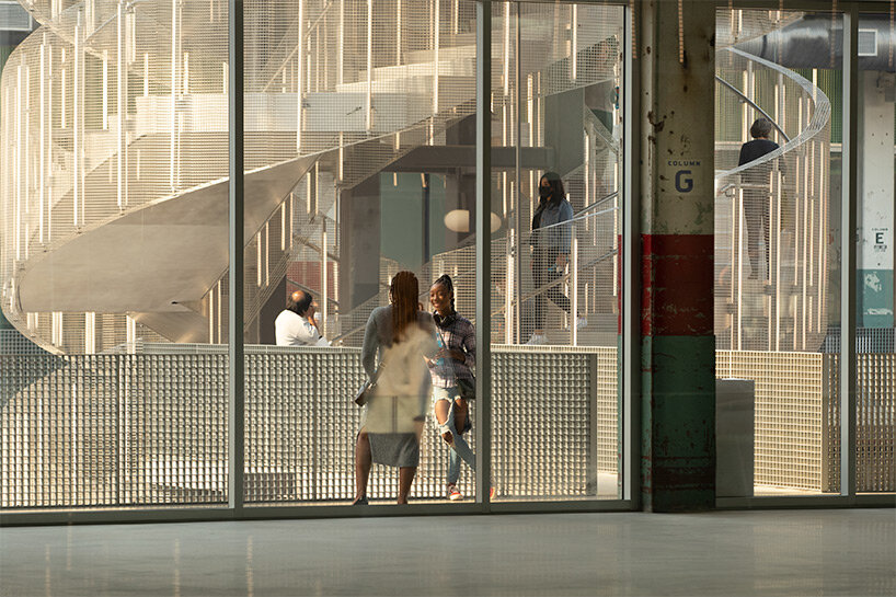 each one of the three atriums features a monumental staircase that leads visitors up to the roofscape, where they can enjoy unobstructed views of the urban surroundings. designed to encourage interaction, the stairs are distinct in character, structure, and material. their paths are doubled, intertwined, and expanded to provide not just access up to the roof but places for accidental encounters.