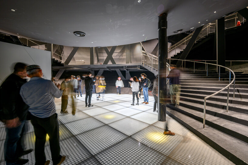The central cube is lifted off the ground to create a landscaped plaza. From there, a free-to-access Public Loop—with portal windows open to view inside the three theaters—runs through the infrastructure and spaces for performing arts production that are typically hidden.