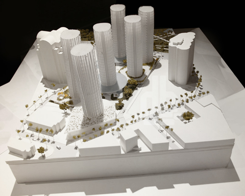 taking advantage of the sloping site which drops approximately 10 feet from the west to the east, OMA’s concept involves the creation of multiple levels to separate functions — the entrances to the individual towers, pedestrians from automotive circulation, and private amenities from public retail, cultural spaces and the relocated bank facilities. the design avoids the all-too-typical ‘podium’ that usually dominates and alienates the surrounding neighborhood. this thoughtful separation of functions appears like flower petals that project and overlap, allowing a pedestrian connection between the town and the bay, between older and residential neighbourhoods and the recreation areas along the water, and between the tree-lined streets of the old city grid and the free forms of nature.