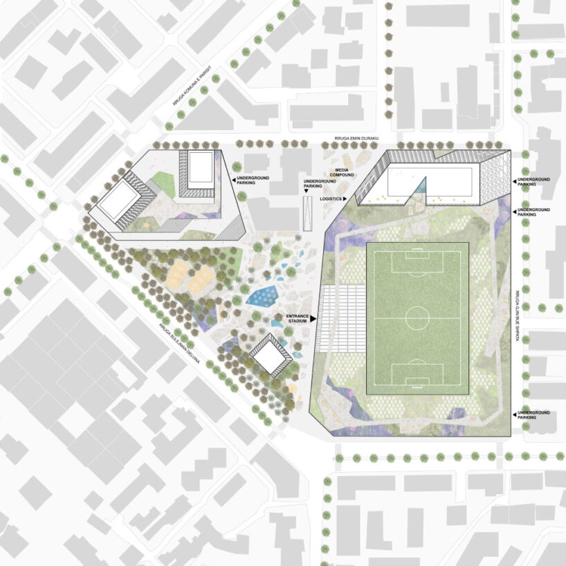 the scheme comprises the stadium itself, a triangular entrance plaza, and a series of new mixed-use spaces