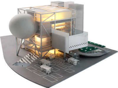 the project sits like a ring placed over the terrain, with its funnel-like roof forming a shaded perimeter walkway and an introverted core.