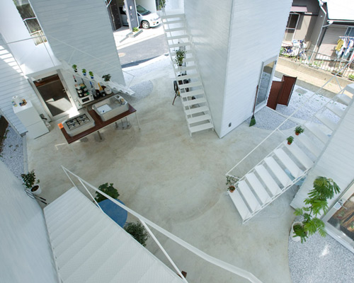 conceived as the main communal space, the courtyard is loosely defined by four, triangular volumes that pinwheel around the center. an outdoor kitchen complete with a sink and stove allows the inhabitants to congregate in this area for a variety of functions. a washroom and storage closets are accommodated  at the ground level of the four pillars, ensuring efficient organization of the second storey. access to the elevated living space above is gained by a series of exterior staircases that wrap around the courtyard. the landings serve as small outdoor terraces that provide visual connection to both the street and communal area below.