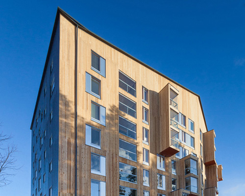 finnish architecture studio OOPEAA has completed a residential block in the jyväskylä suburb of kuokkala – the first eight-storey wooden apartment building in finland. developed in collaboration with lakea, ‘puukuokka’ is an energy-efficient trio of multi-story timber-framed flats that neighbor the kuokkala church – also designed by OOPEAA. the completed building is the first part of a larger apartment complex, which will be built over the next two years. the buildings are composed of prefabricated modular elements made of cross laminated timber – utilizing the urban multistory concept developed by paper manufacturers stora enso. planned in collaboration with the jyväskylä city planning department, the project offers affordable, eco-efficient housing that is readily adaptable to the occupants’ changing needs.