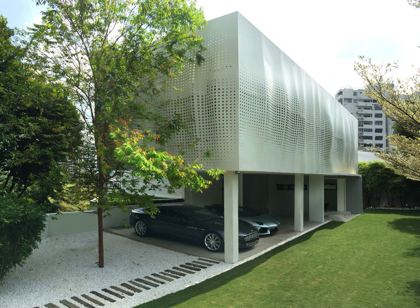 as a collector of contemporary art and design, the owner also wished for the highly visible entrance structure to act as an extension of his art collection while blending with the existing street and landscapes. OOZN referenced the idea of a soft bedroom curtain enveloping the interior space and transposing it to the pavilion’s exterior with a flowing aluminium fabric skin. the flowing skin is then perforated to pass on light to the interior whilst the perforation pattern density follows the layout of the existing windows.