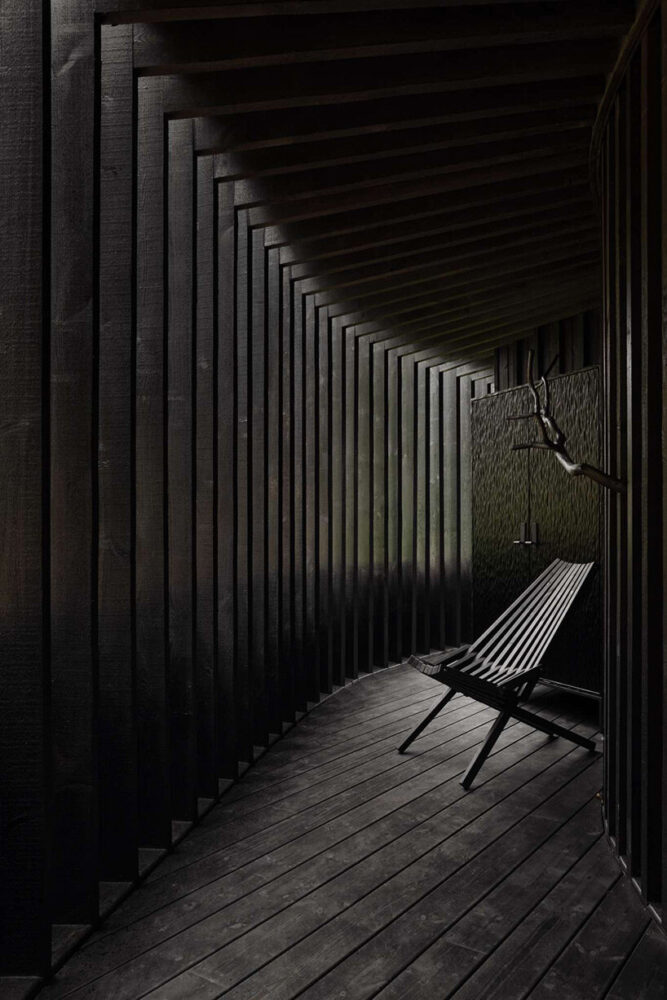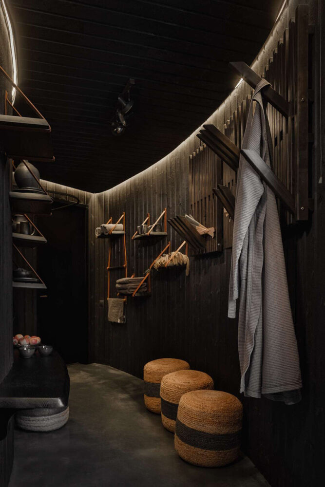 focusing on a meditative approach, open AD has formed a sauna that ties in with the existing resort, yet also has its own unique energy and identity. meanwhile, every single detail contributes to generating a sensory and spiritual experience. as a first step, the team created a winding wooden walkway that leads guests towards the sauna building. not merely a practical means to get from A to B, the weaving path prepares the mind for what’s to come, encouraging introspection.