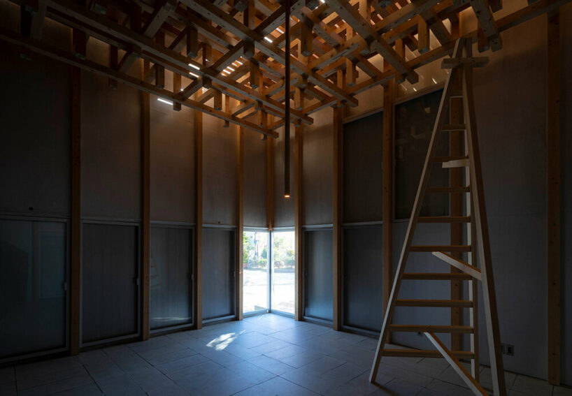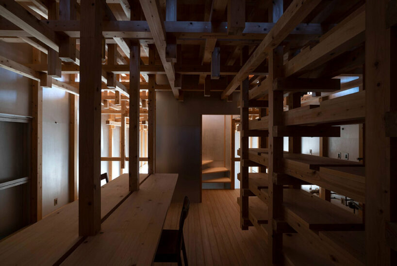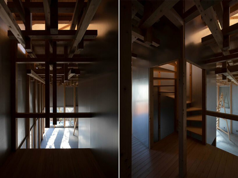 Seiichi Yamada and Associates approached the design of the residence with respect to traditional Japanese houses, but also with the idea of building in the future. ‘We are trying to build Japanese houses in the future without falling into nostalgia by renewing styles and traditions,’ explain the architects. The building’s construction features cypress pillars, erected on the outer peripheral surface of a 3 x 6 angle at a pitch of 900 mm and tied in the shape of a gable roof. Flat lattice beams assembled at a pitch of 1,800 mm are stacked by shifting them 900 mm to the left and right to create a beam frame. By tying the pillars together, the slenderness ratio is cleared while providing a heat insulating layer. In this way, ‘the frame becomes a skeleton that floats like a cloud inside the building.’ The home’s three levels are connected vertically by a wooden staircase, while a small light passing through the frame illuminates the ground floor.