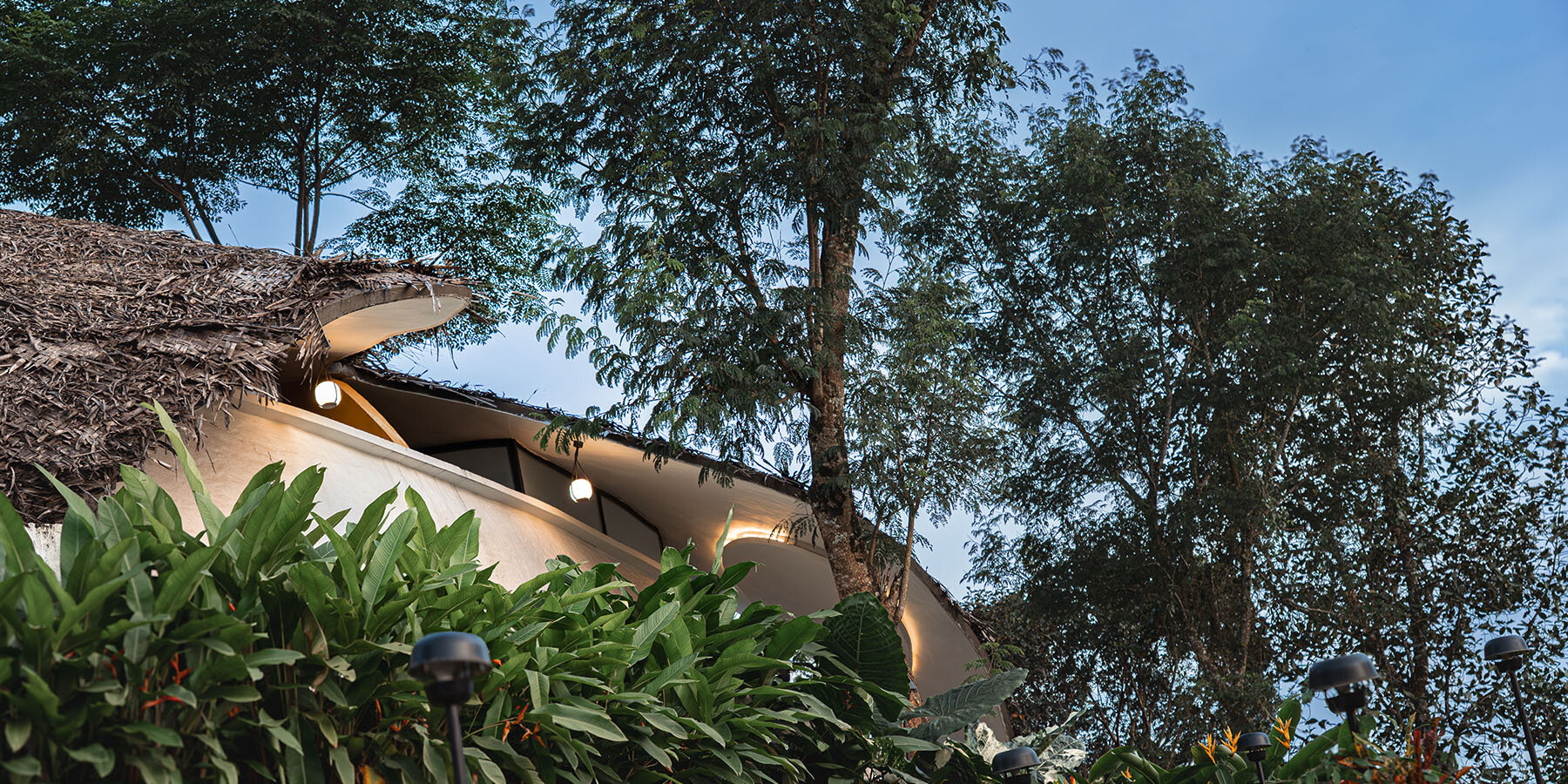 the retreat glows softly against the Wayanad sky, highlighting its curving shell walls and thatched roof