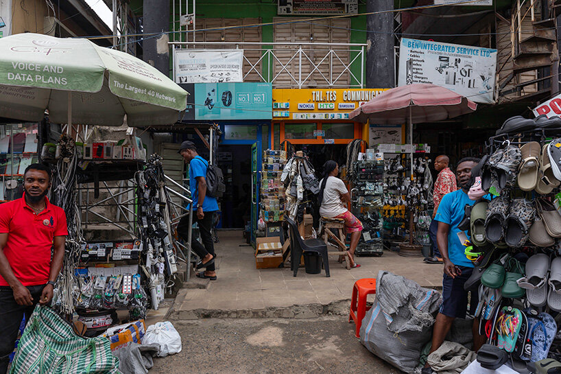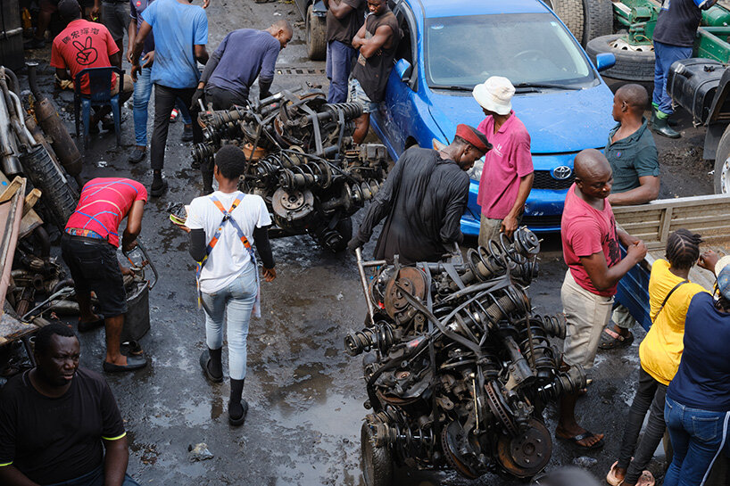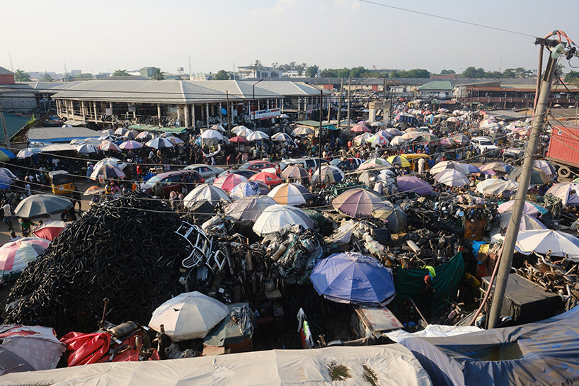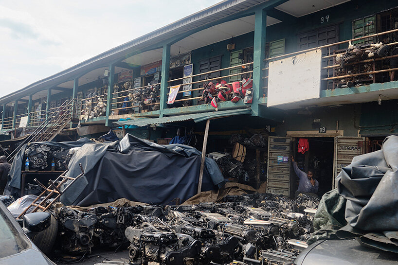Ladipo Market deals in second-hand car parts; Computer Village in used electronics; and Katangua in recycled fashion. While their contents differ, their shared value lies in how they extend the life of consumer goods through a communal network of reuse, repair, and resale. ‘These specialist markets emerge across the city in white and brown-fill sites, residential zones, and defunct industrial parks,’ Tosin Oshinowo shares with designboom. ‘Through a collective intelligence, the city operates at a sophisticated level outside of orthodox methodologies and functions at scale without the expected industrialized infrastructure.’ Her exhibition doesn’t romanticize the struggle but rather reframes Lagos’s informal urban systems as prototypes for sustainable cities—systems built from adaptation, making them increasingly relevant in a time of global resource scarcity.