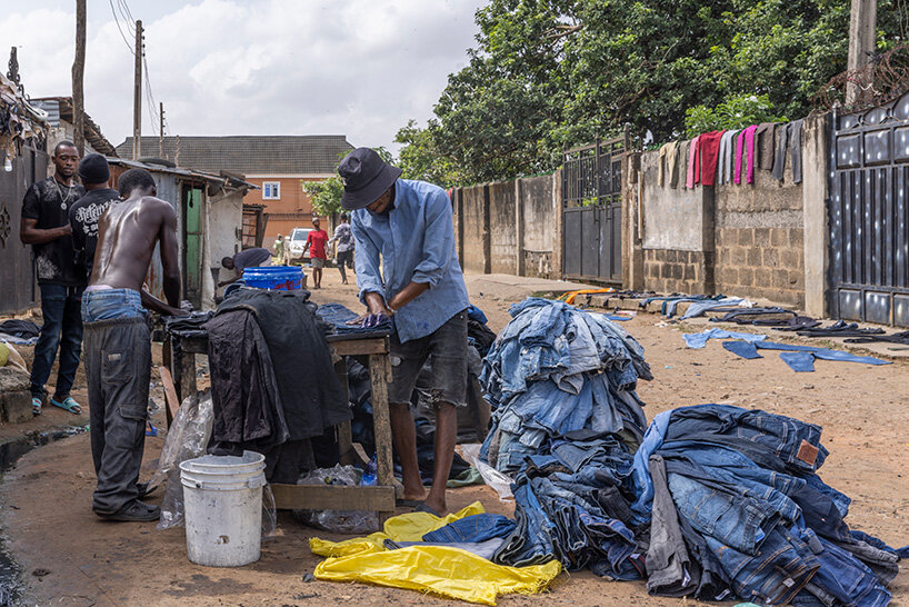 Lagos-based architecture practice Oshinowo Studio brings ‘Alternative Urbanism: self-organising markets of Lagos‘ to the 19th International Architecture Exhibition of the Venice Biennale, spotlighting three of the city’s most dynamic informal markets—Ladipo, Computer Village, and Katangua. Invited by curator Carlo Ratti to respond to his circular economy manifesto, the studio explores how these systems repurpose waste from the global north into valuable goods, offering a powerful model of embedded circularity. ‘These markets don’t work just as places of commerce and exchange,’ notes founder Tosin Oshinowo in an exclusive interview with designboom. ‘What is fascinating is the factory-like process that occurs when a source material is re-appropriated and adapted through different sectors in these markets,’ she tells us. Through immersive film, photography, data visualisations, and recycled denim maps crafted in Katangua, the exhibition reframes Lagos’s markets as complex infrastructures of ingenuity, shaped by scarcity and sustained by collective intelligence.