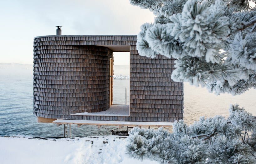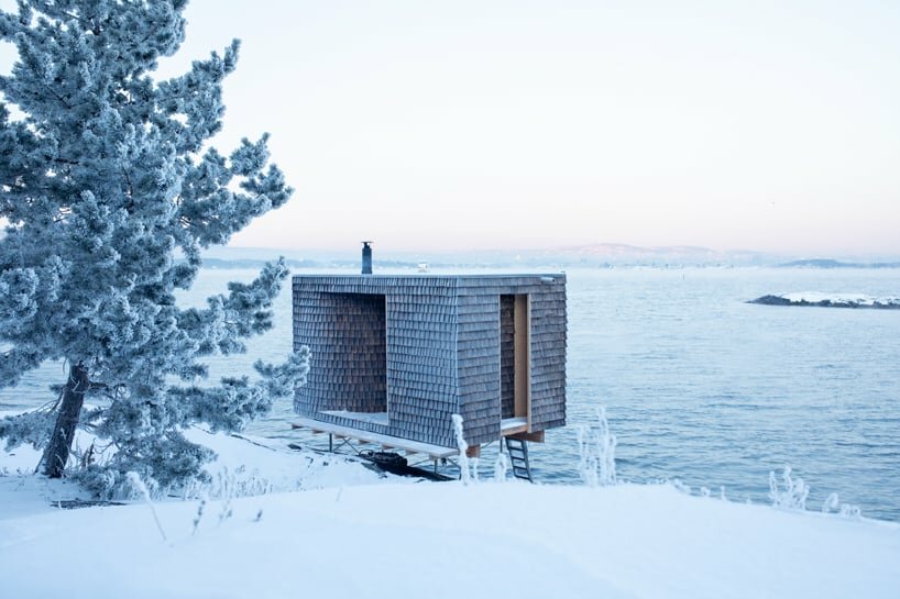 oslo works' wooden sauna perched above norwegian shore invites remote relaxation