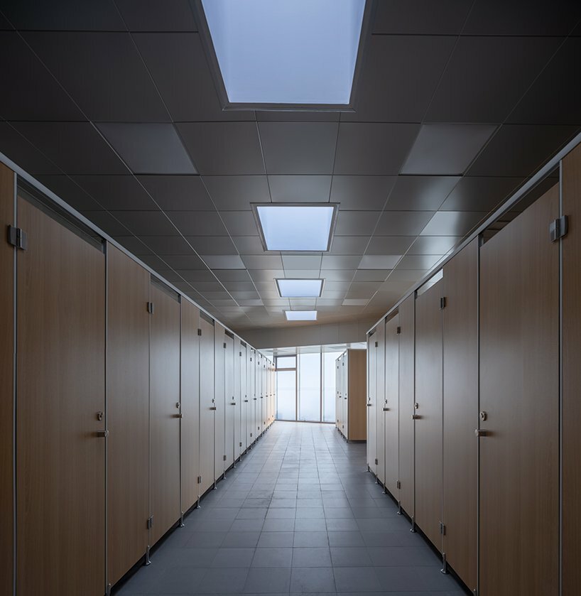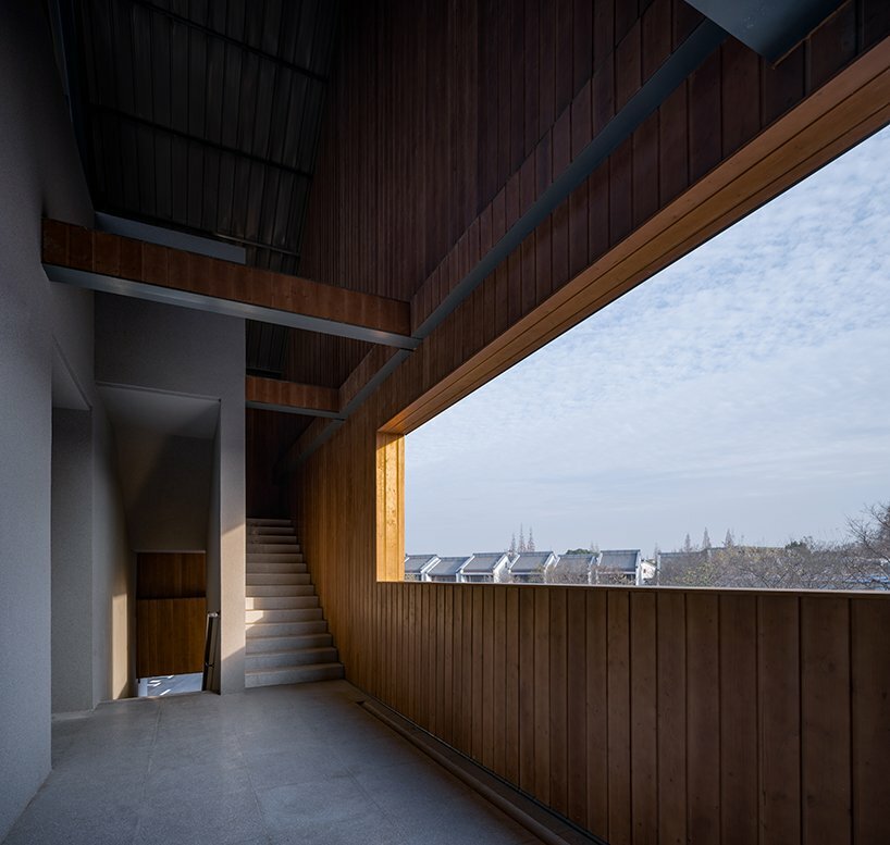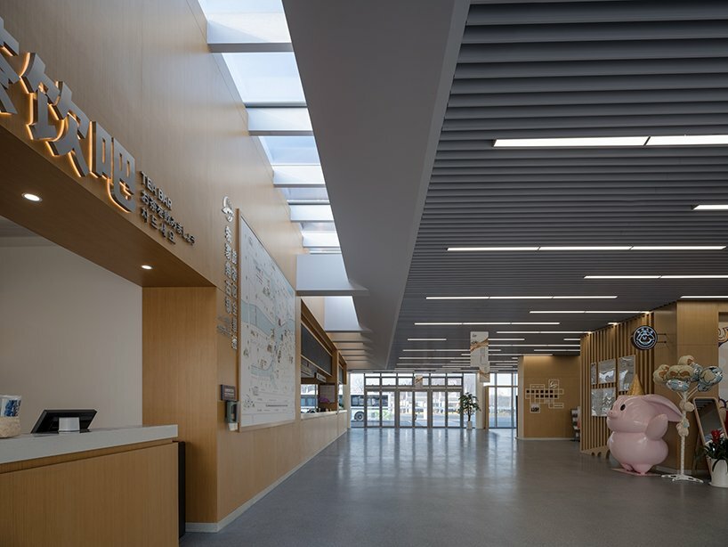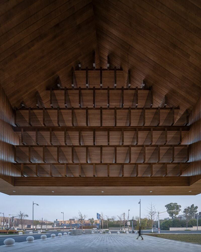 the project sits like a ring placed over the terrain, with its funnel-like roof forming a shaded perimeter walkway and an introverted core.
