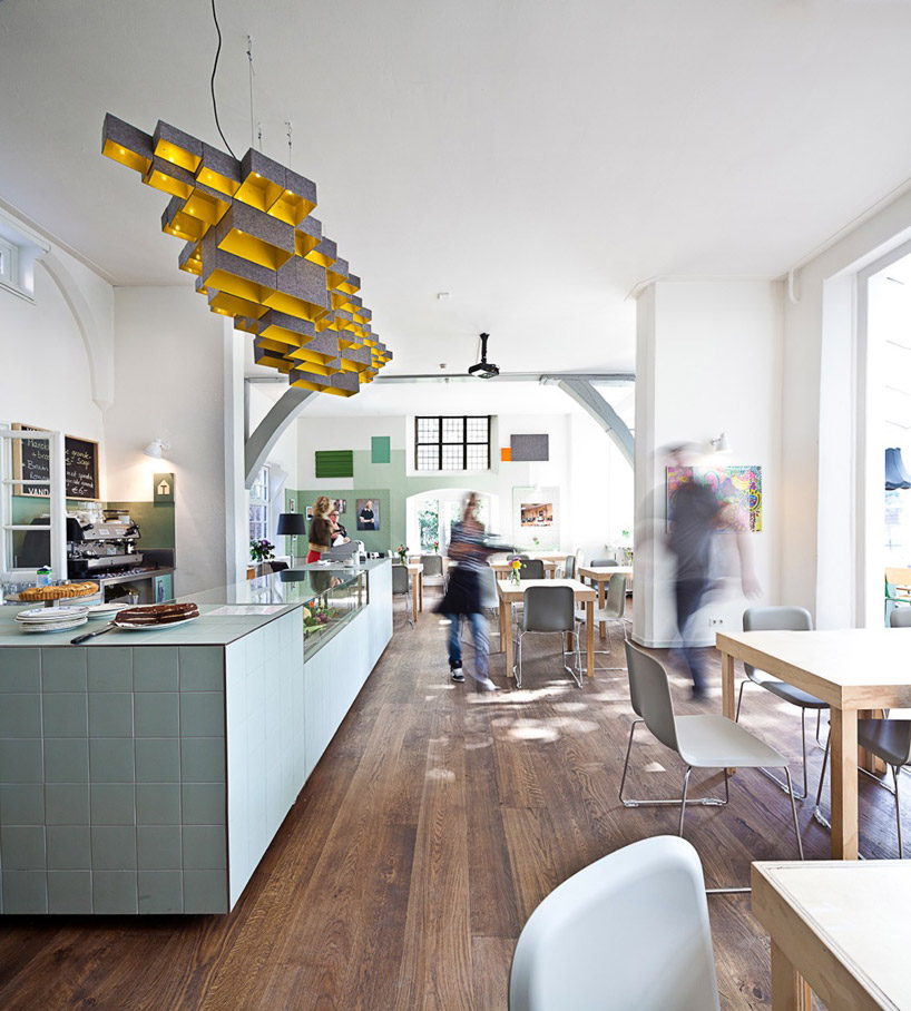 custom-designed furniture integrates and caters to the specific qualities of individuals with psychiatric problems, allowing ease of assembly by volunteers. a bar counter is covered with matte glazed tiles. a metal box chandelier surfaced with wool felt, matching a modular bookcase for magazines, colored acoustical panels and picture frames. the oak of an original bench has been re-purposed into a long table and used lampshades were reupholstered with grey velvet for pendant lighting. an eclectic collection of interior elements contribute to a warm atmosphere.