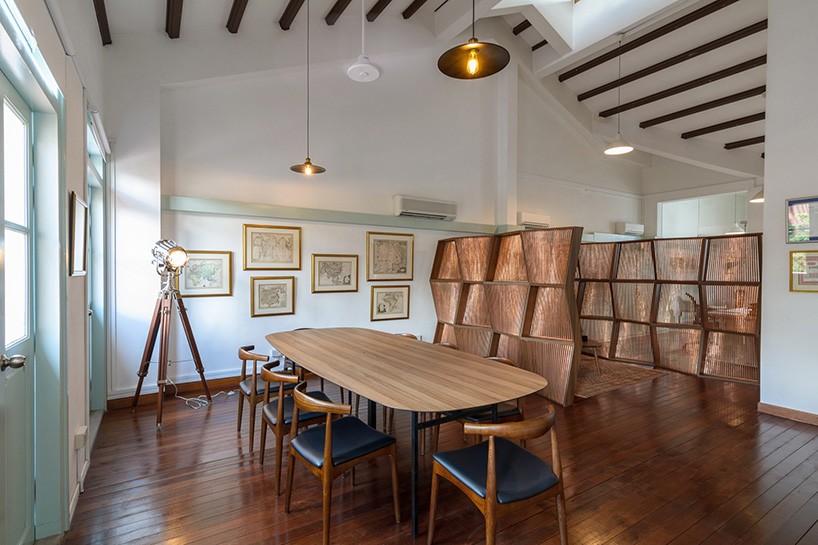 singaporean studio OWMF architecture, led by yong sy lyng, translates water works infrastructure into a cohesive interior for odyssey capital; a finance and investment firm. utilizing the industry’s most ubiquitous feature — the copper pipe — the concept uses wave-like screens to partition the reception, meeting, and work areas. providing privacy through layering, the elements create a multi-dimensional environment for the office. architectural accents, in shades of blue, subtly reinforce the importance of water within. ‘odyssey capital’ is located in the raffles place financial district of singapore.