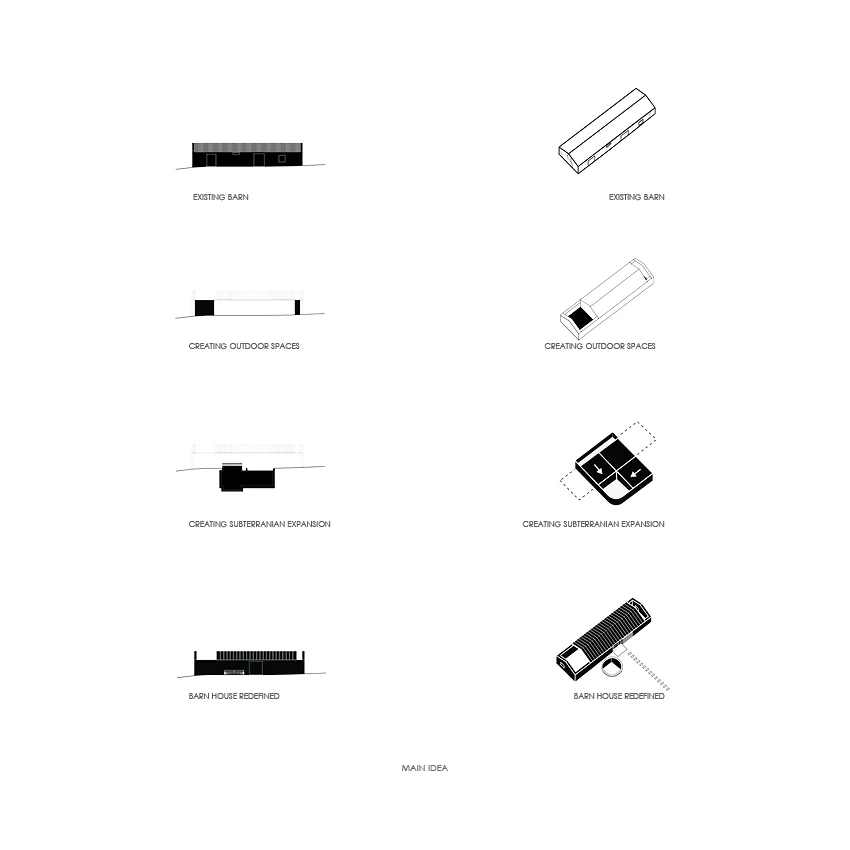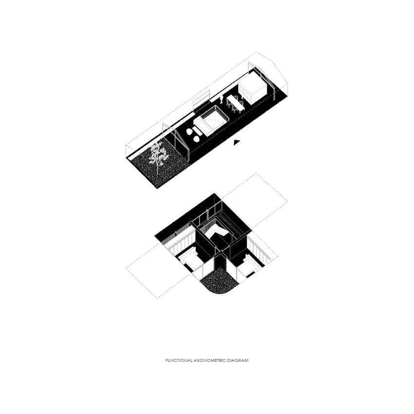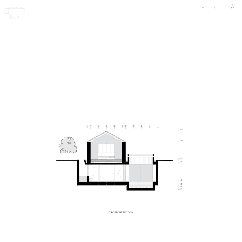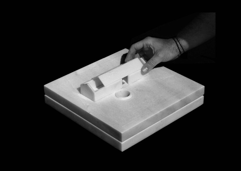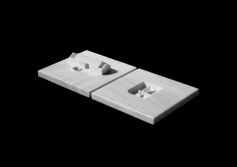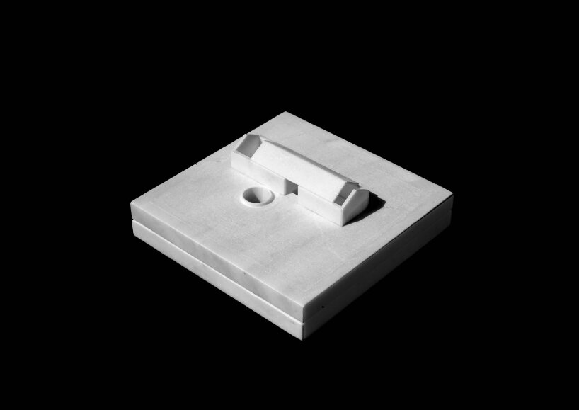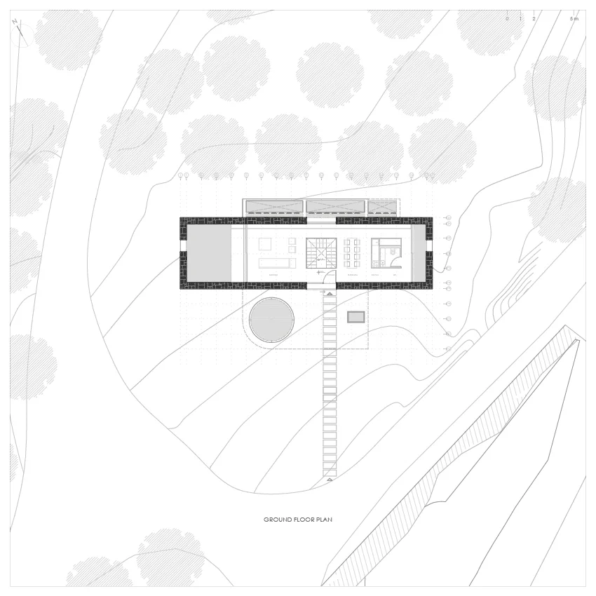 the project sits like a ring placed over the terrain, with its funnel-like roof forming a shaded perimeter walkway and an introverted core.