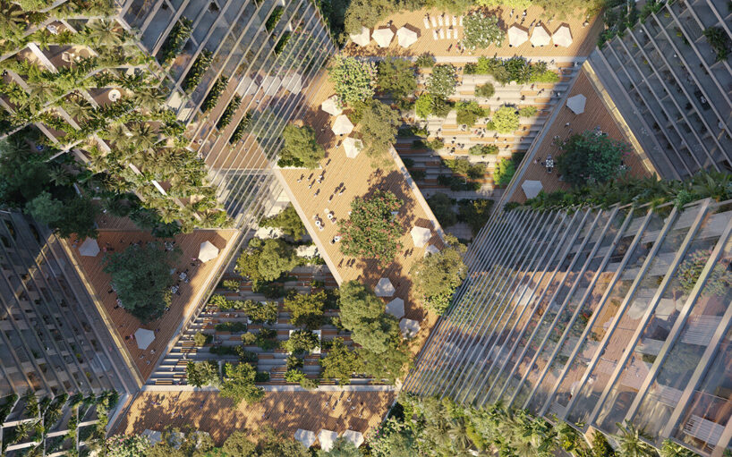 the project sits like a ring placed over the terrain, with its funnel-like roof forming a shaded perimeter walkway and an introverted core.