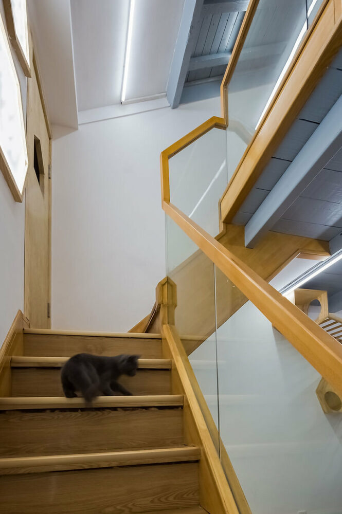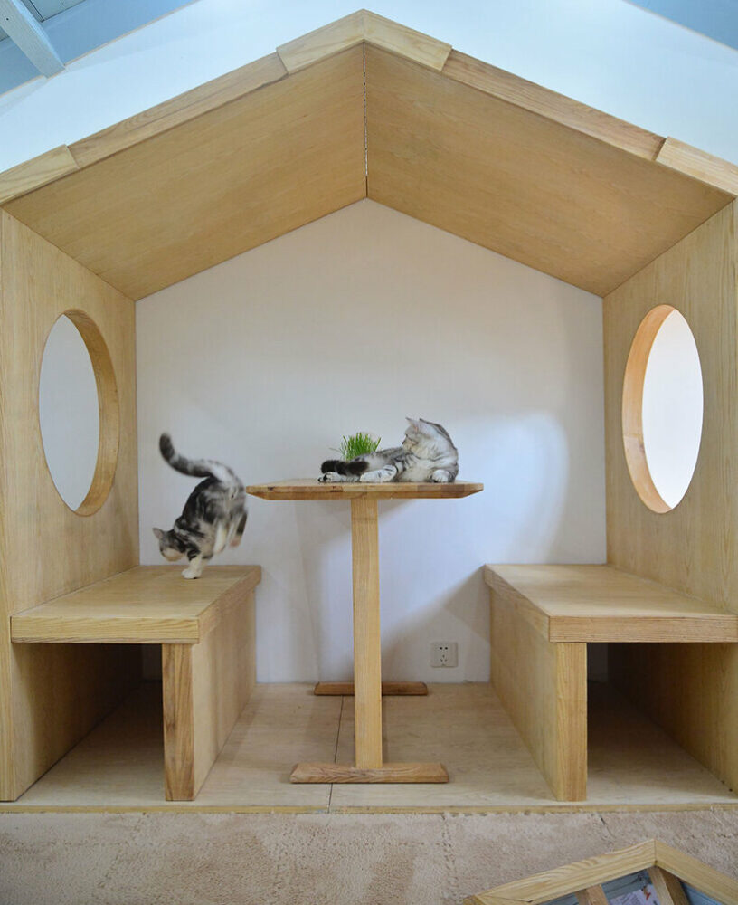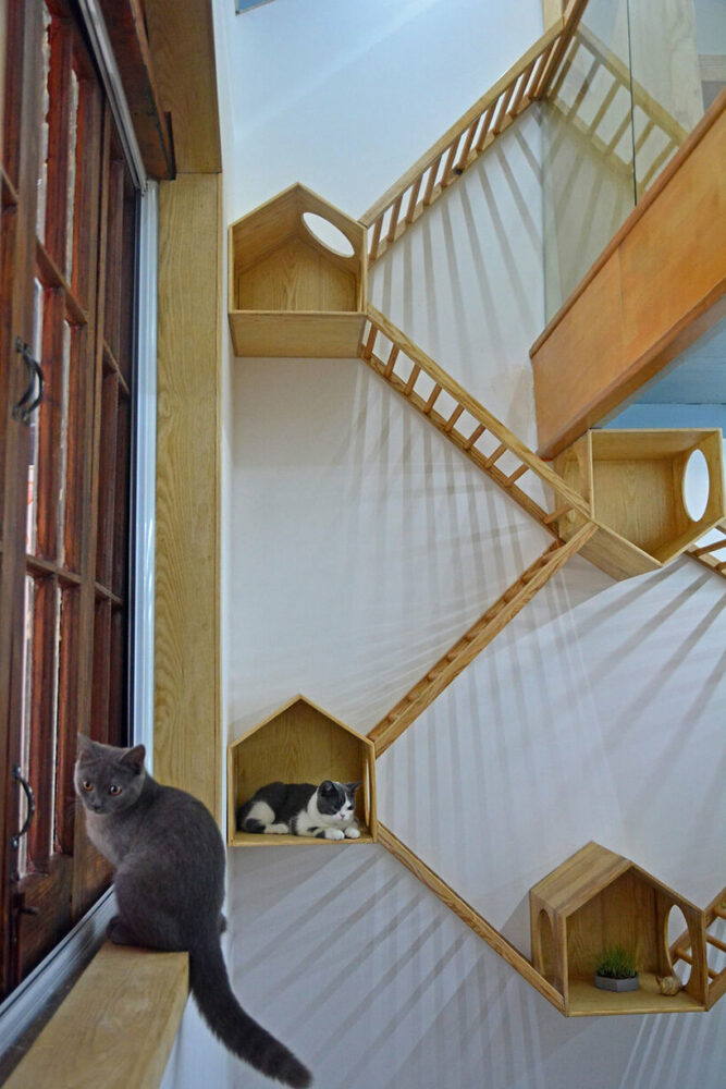 wooden ladders + tiny houses zigzag through parallect design's cat café in shanghai