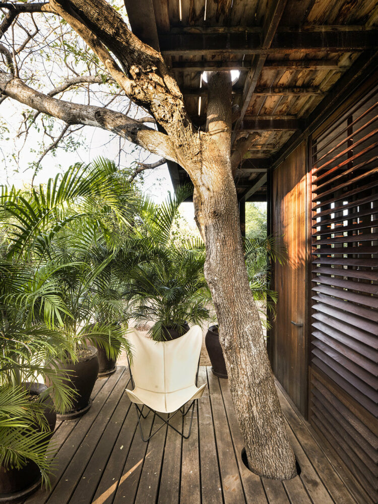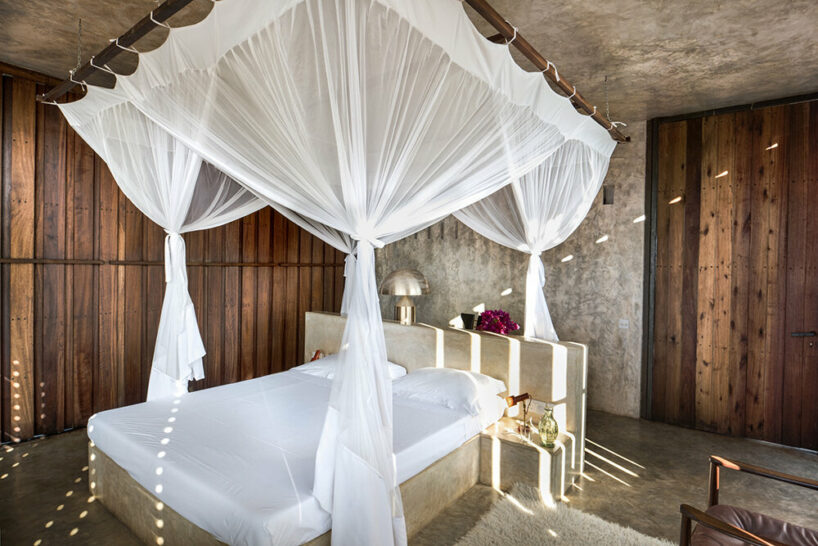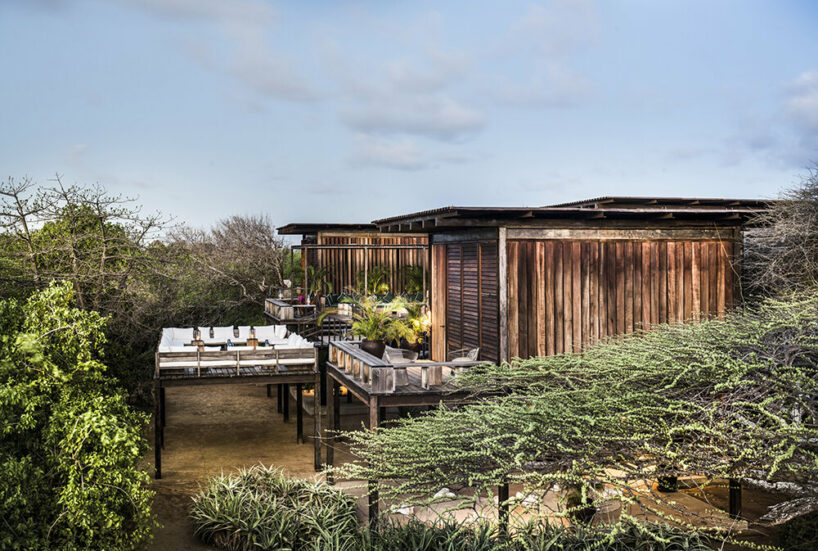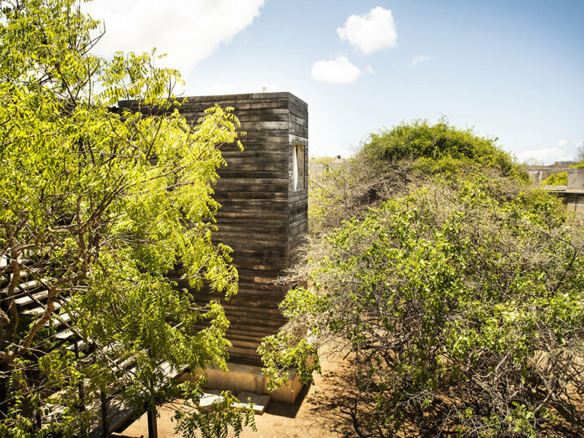 The architectural layout of Falcon House reveals separate, raised rooms, allowing the prevailing winds (the Kaskazi, blowing from the northeast between December and March, and the Kusi, blowing from the south between April and September) to naturally cool the rooms, eliminating the need for air conditioning. Electricity, generated through photovoltaic panels, powers a desalination system, converting seawater into potable water for domestic use. Rainwater collected in tanks also contributes to the water supply. The house is a scattered assembly of individual pavilion-style structures, each elevated to approximately 3 meters above ground on steel stilts, carefully positioned to harmonize with the existing acacia and baobab trees. In crafting this suspended landscape, PAT. (see more here) and Ferdinando Fagnola subsequently opted for a steel construction system. This decision not only emphasized the house’s distinctive design language but also ensured a more cost-effective construction process, including carefully disassembly pre-existing bungalows to salvage their wooden planks.