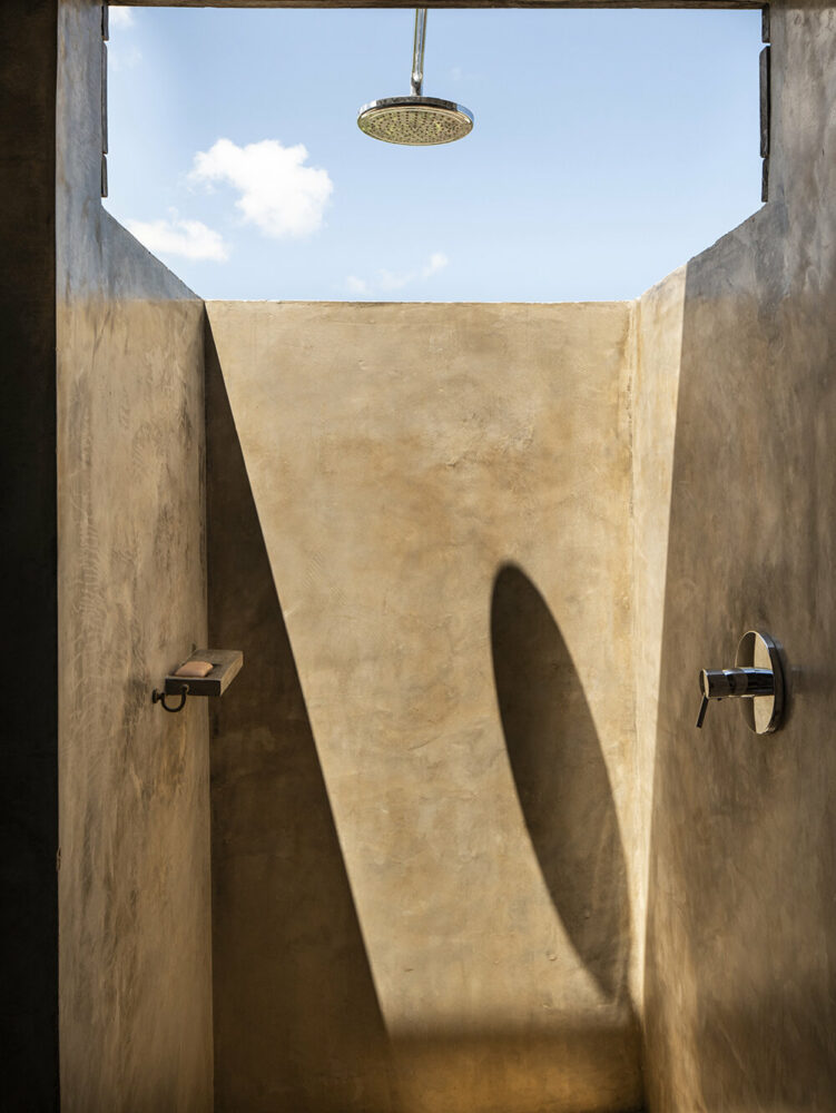 Tradition arises through ‘niru,’ a smooth stucco finish that complements the clean lines of the new structures, adorning the walls, masonry elements, and even the interiors of the more traditional buildings, conveying a sense of solidity and intimacy. Instead of relying on complex mechanical systems, climate control is achieved through the structures’ orientation, shading, and natural ventilation, returning the project to the traditions of tropical modernism that the widespread use of air conditioning has overshadowed. Lastly, electricity required for all domestic uses, from water purification and heating to lighting, is provided by photovoltaic panels. In this context, the utility building adjacent to the house plays a fundamental role: it is a ‘machine for living in and living well,’ with architecture that combines energy production through panels covering the entire roof and resource procurement, completed by the water tower.