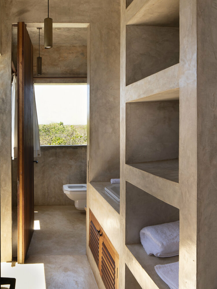 The pavilions and terraces at varying elevations link up via a straight walkway. Service and served spaces sit distinctly separated, with bathrooms and wardrobes in turrets behind the rooms, connected by small bridges. The rooms, elevated to the level of the tree canopies, are sheltered under a flat concrete roof, insulated on the outer layer, supporting a ventilated roofing system made of corrugated corten steel, designed to keep the rooms shaded throughout the day. The ceilings and floors are cast-in-place concrete, while the south wall comprises on-site prefabricated concrete blocks created by local craftsmen using custom wooden formwork. The shaded and ventilated concrete mass acts as a thermal flywheel, helping regulate the room’s microclimate, with adjustable wooden slats on the east and west walls. Four large pivot doors allow the north facade to open onto the sea-facing terraces. The adjustable louvers allow for the control of natural light and ventilation. This adaptable and manually operated climate control system, developed with local artisans, resulted from various mock-ups to arrive at the chosen solutions.