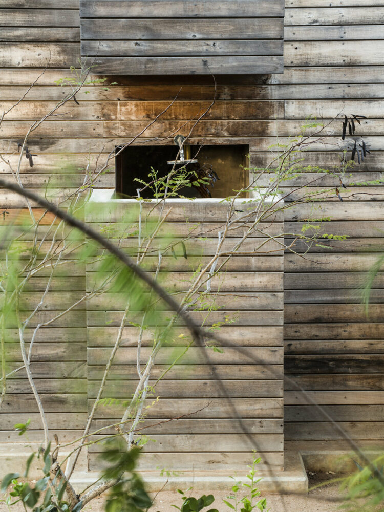 external decks and the bathroom tower cladding feature reclaimed wood from on-site structures