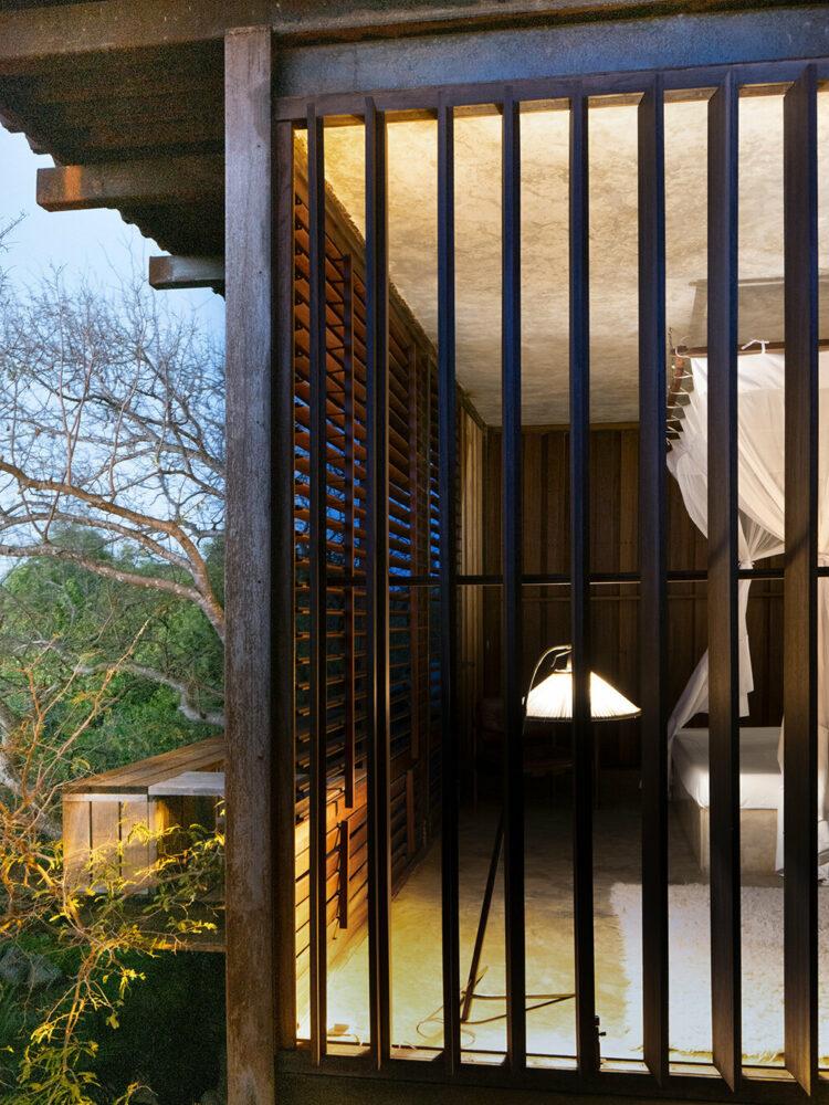 The steel components are fabricated in a workshop just a few kilometers away, transported by boat, and assembled on-site. In constructing the external decks and cladding for the bathroom tower, eucalyptus wood, an abundant and renewable local resource, was chosen, in addition to reclaimed wood from the dismantled existing structures on site. This approach avoids using endangered species like mangroves, which are overused. The stronger and more resilient iroko wood was specifically reserved for crafting the sunshade fins to ensure the system’s durability. Local craftsmen employed two-centimeter opposing and coupled boards to fashion counterbalanced slats, ensuring long-term dimensional stability. The entire wooden wall system is adjustable and manually operated using mechanisms inspired by simplicity and attention to detail, including wooden pins and sliding handles. The southern walls offer shelter and promote ventilation within the different volumes; they consist of custom-made concrete blocks manufactured on-site to match the thickness of the steel columns. These blocks are intentionally spaced apart, forming a pattern of openings for air to flow through the interiors.