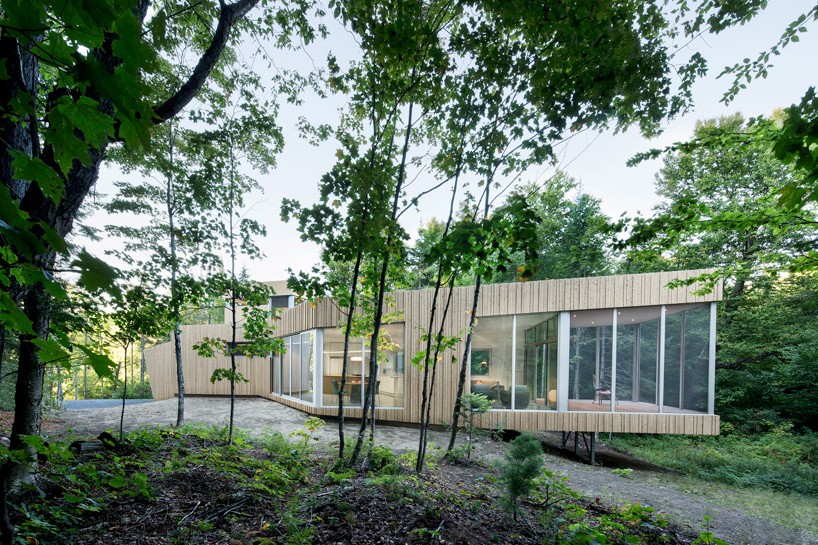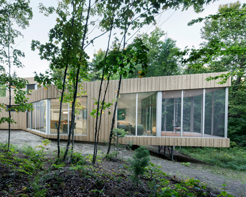 located in a rural area 90 minutes outside of montreal, this single-story lakeside house has been designed by canadian architect paul bernier. named ‘house on lac grenier’, the dwelling is entirely clad with vertical cedar slats, weatherproofed to protect the property from the region’s severe climatic conditions. the form of the home responds to its woodland setting, mediating the undulating terrain and bending around exiting trees.