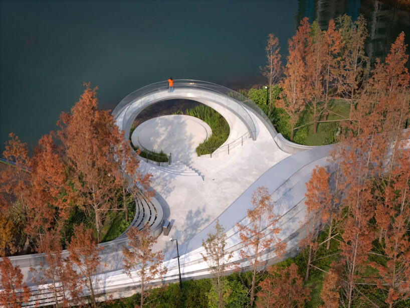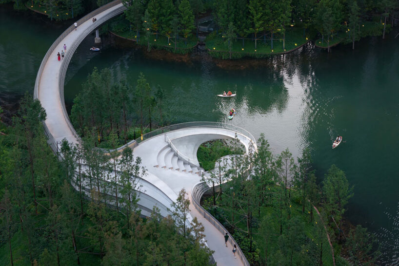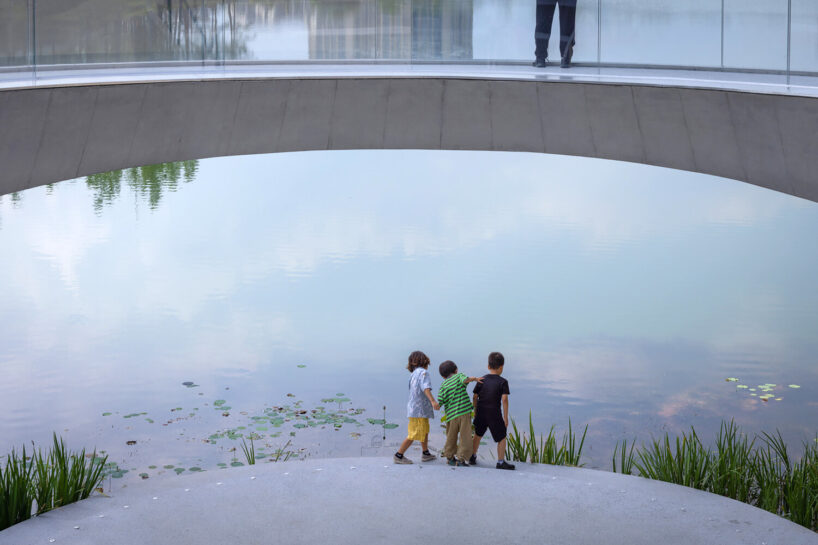 a cantilevered walkway over the water introduces movement while framing views of the lake