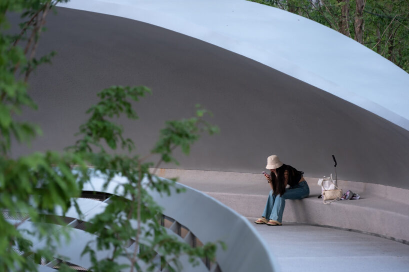 curved white concrete interacts with light and water, creating changing visual effects throughout the day