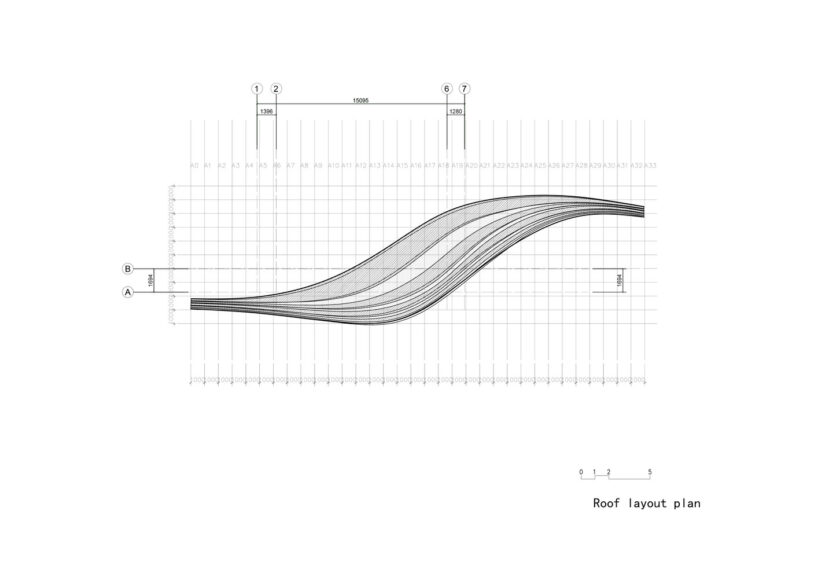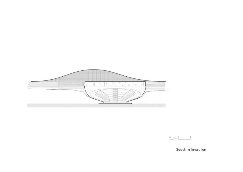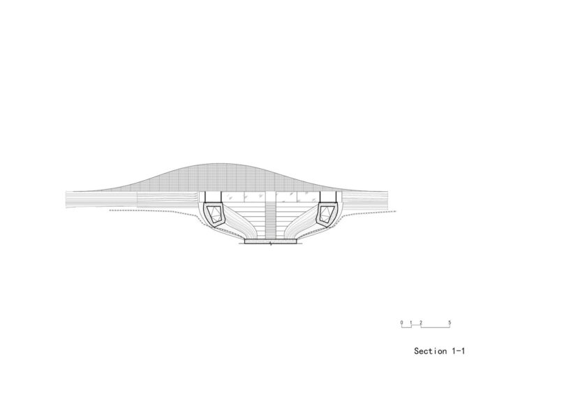 the project sits like a ring placed over the terrain, with its funnel-like roof forming a shaded perimeter walkway and an introverted core.