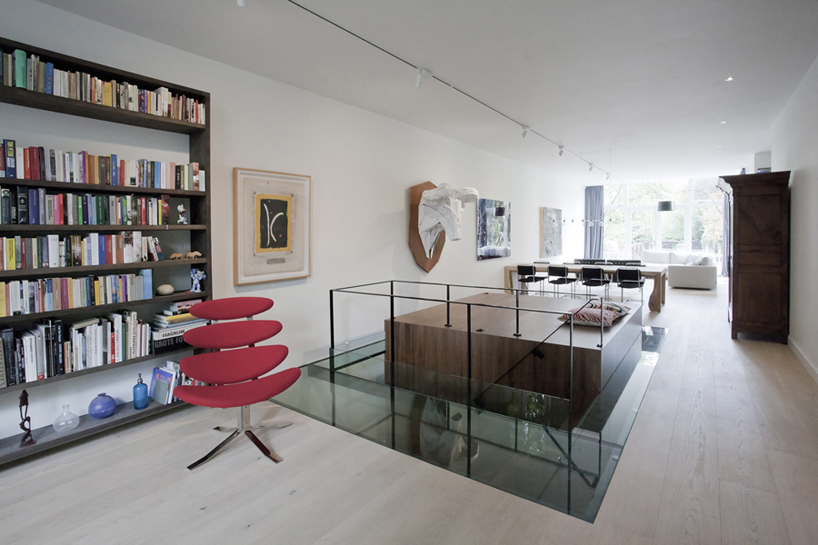 a key element is a walnut cube piece, which begins on the ground floor and protrudes through the first floor living room, forming a raised platform. surrounded by walkable glass, the feature helps to divide the open-plan space, offering a clear distinction between the front and rear. the stairs to the basement are accessed from here also, while the glass enables light to filter down. the use of walnut as a material combined with black has been applied throughout the apartment, unifying an overall sleek and refined aesthetic.
