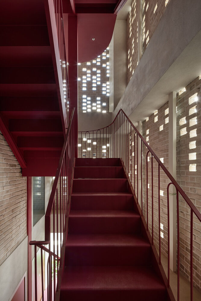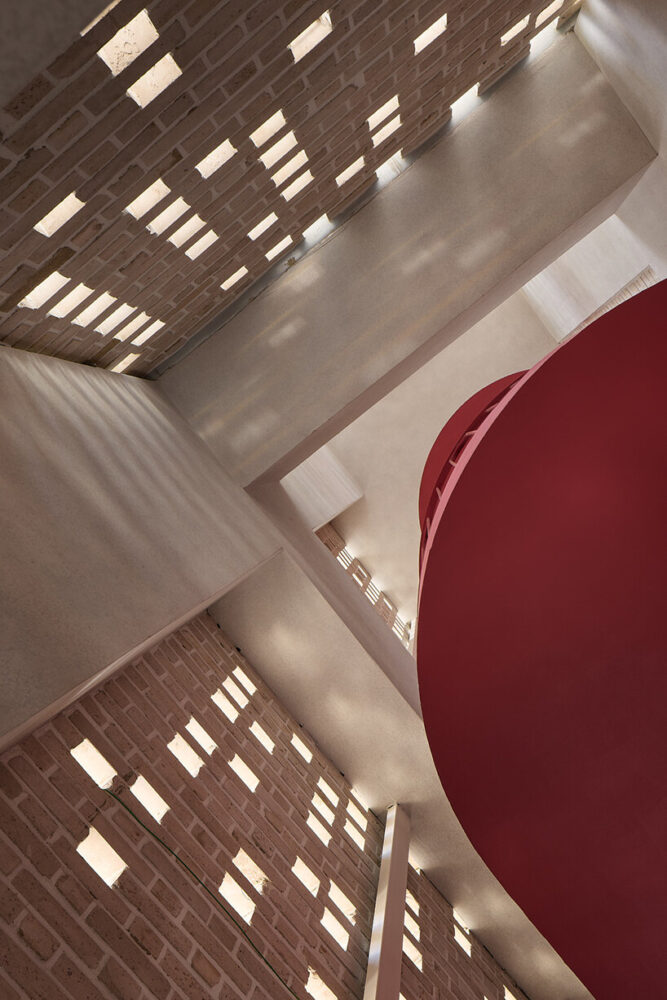 the project sits like a ring placed over the terrain, with its funnel-like roof forming a shaded perimeter walkway and an introverted core.