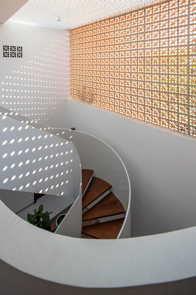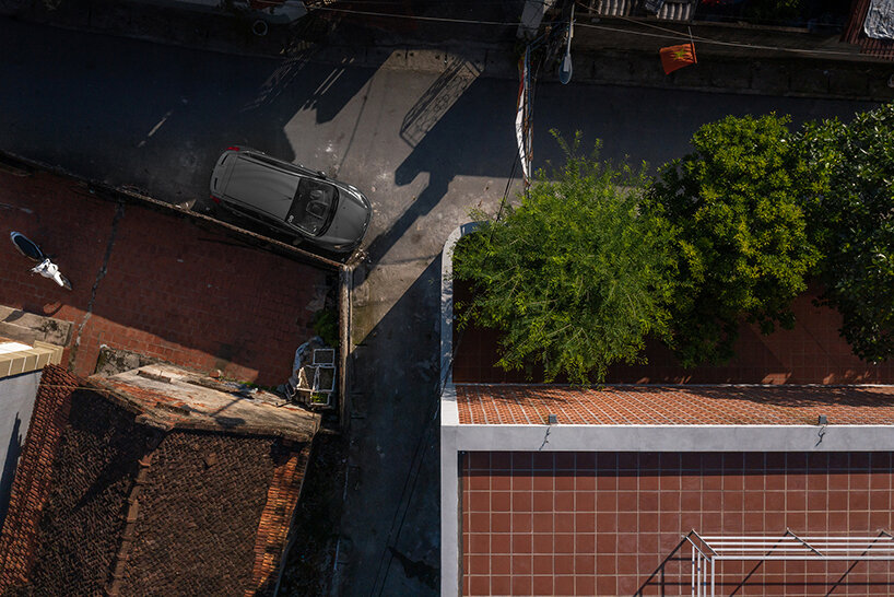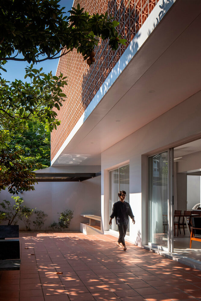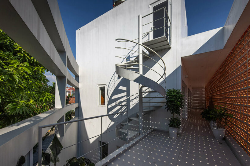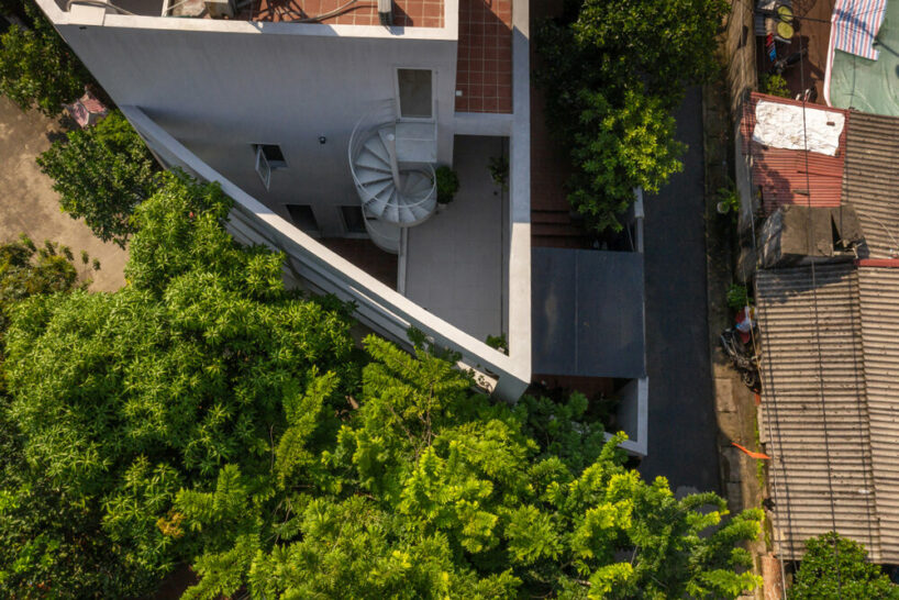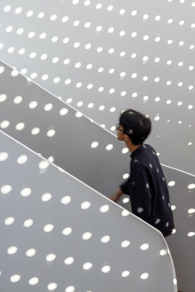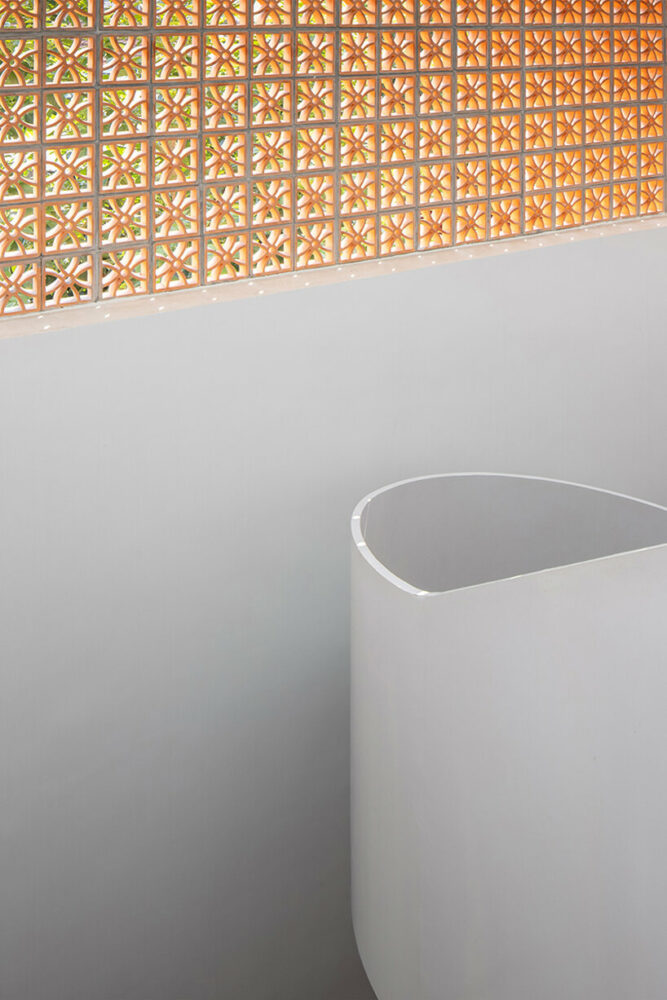 the project sits like a ring placed over the terrain, with its funnel-like roof forming a shaded perimeter walkway and an introverted core.