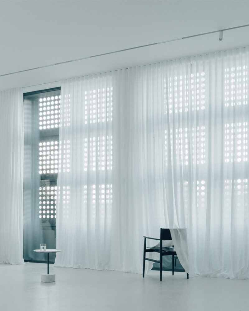 The building forms a protective architectural envelope that encloses the site and generates a private interior landscape. The street facade appears as a continuous rusted steel surface punctuated by a sequence of large perforated iron doors. These pivoting panels function as a dynamic environmental and spatial filter. When closed, the facade reads as a monolithic metal screen, offering privacy and protection from the street. When opened, the panels transform the building into a porous structure that allows light, air, and views to penetrate the interior spaces. The perforations create constantly shifting patterns of light and shadow throughout the day, giving the otherwise solid envelope a sense of movement and temporal variation.