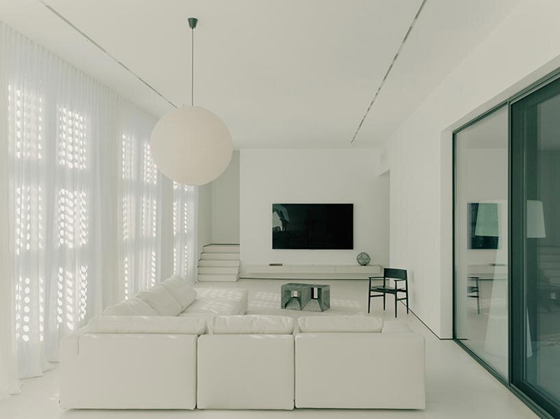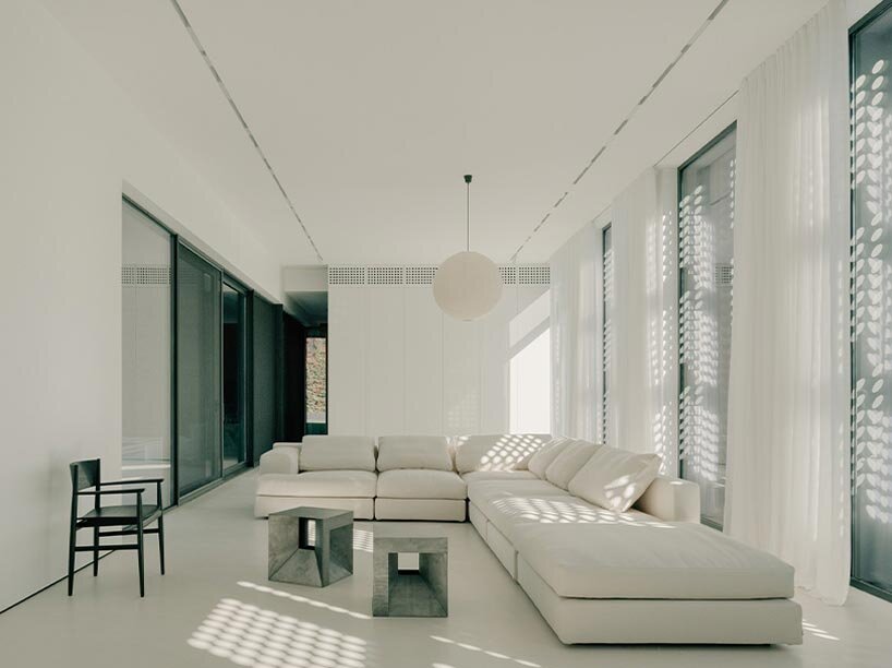 Material choices reinforce the dual character of the project. The exterior is defined by weathered steel surfaces that emphasize solidity and durability, while the interior spaces are deliberately calm and minimal. White walls, light floors, and restrained detailing create bright, quiet environments where natural light becomes the primary architectural element. The filtered sunlight passing through the perforated screens produces soft patterns that animate the interior throughout the day. The lower level contains auxiliary functions, including parking and technical spaces, while the upper level incorporates additional amenities such as an indoor pool and terrace areas that extend the living environment vertically. These spaces maintain the same relationship with light and enclosure that defines the rest of the house.