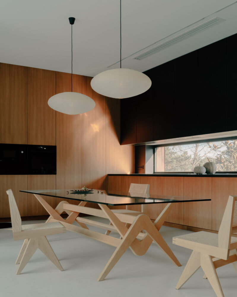 Behind its outer layer, the house organizes its spaces around an inward-oriented courtyard. All primary living areas are directed toward this internal garden rather than toward the surrounding streets and neighboring plots. Through this strategy, TIMM Architecture Studio allows the interior to maintain openness and transparency while preserving privacy from the outside. The courtyard becomes the spatial and environmental center of the house, providing daylight, greenery, and visual continuity across different levels of the dwelling.
