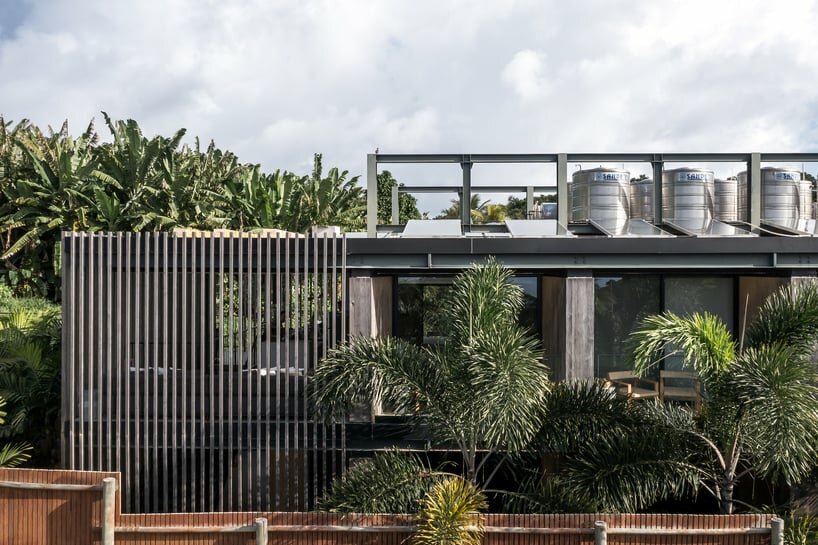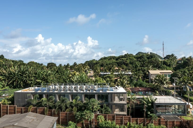 the building adapts to the topography, featuring three interconnected blocks linked by a walkway