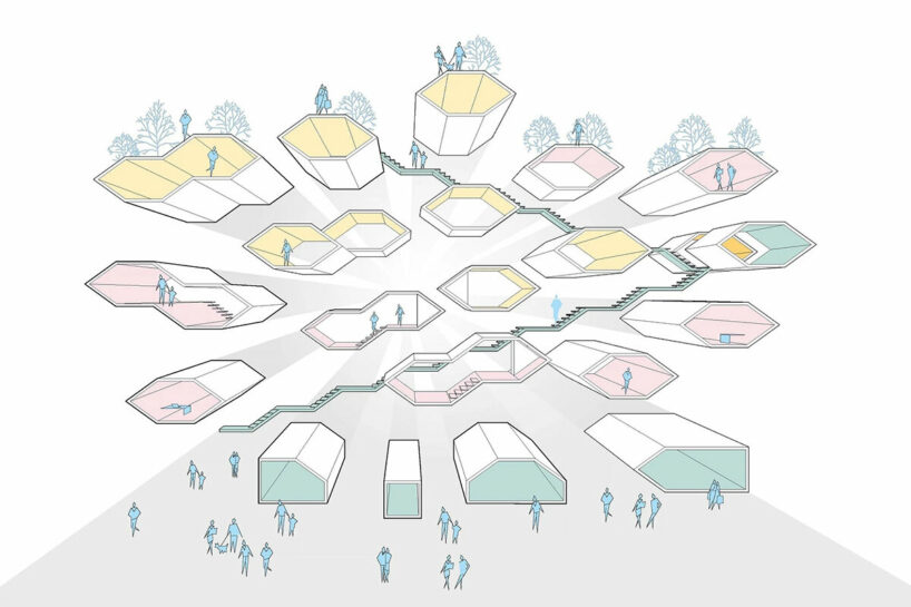 the project sits like a ring placed over the terrain, with its funnel-like roof forming a shaded perimeter walkway and an introverted core.