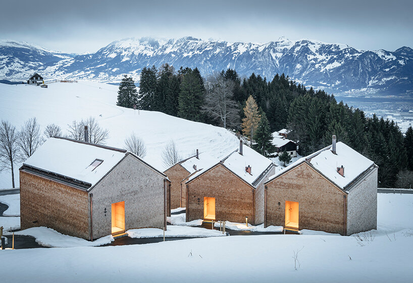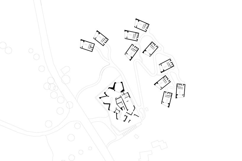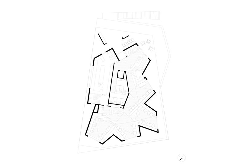 the project sits like a ring placed over the terrain, with its funnel-like roof forming a shaded perimeter walkway and an introverted core.