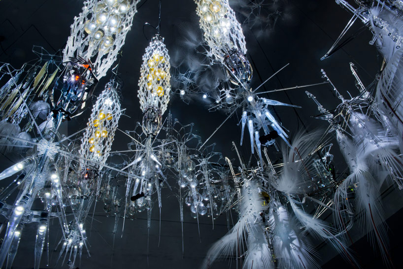characteristically consolidating the disciplines of architecture, art and science, philip beesley has installed a complex and luminous composition of responsive systems in form of ‘radiant soil’ as part of the ALIVE / EN VIE exhibit at espace EDF fondation in paris. while the showcase highlights the plethora of bioengineered and living systems in design, the trained architect has manifested a vertiable colony of interlinking clouds that respond to the movement and spatial memory of visitors. various polymers, metals and glass are suspended in variously shaped filter layers that ‘ contain a near-living carbon-capture metabolism.’ the high-hanging complex pods track motion and are powered by proximity– all while radiantly occupying the architectural space. understanding soil as a distinctly hybrid material that begets life and ties together whole ecosystems, the work recreates the architecture of living systems with an accretion of moving frond clusters fitted with shape-memory metals, microprocessors, reactive bulbs that set off bursts of light and scent-emitting glands to attract viewers, thereby providing a loop for the catalytic system. some pods operate with convective plumes of air, while others are helical arrangements of LED lights that make manifest ripples of response; the result is a poetic and illuminated confrontation with nature.