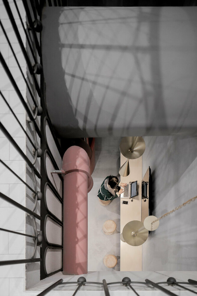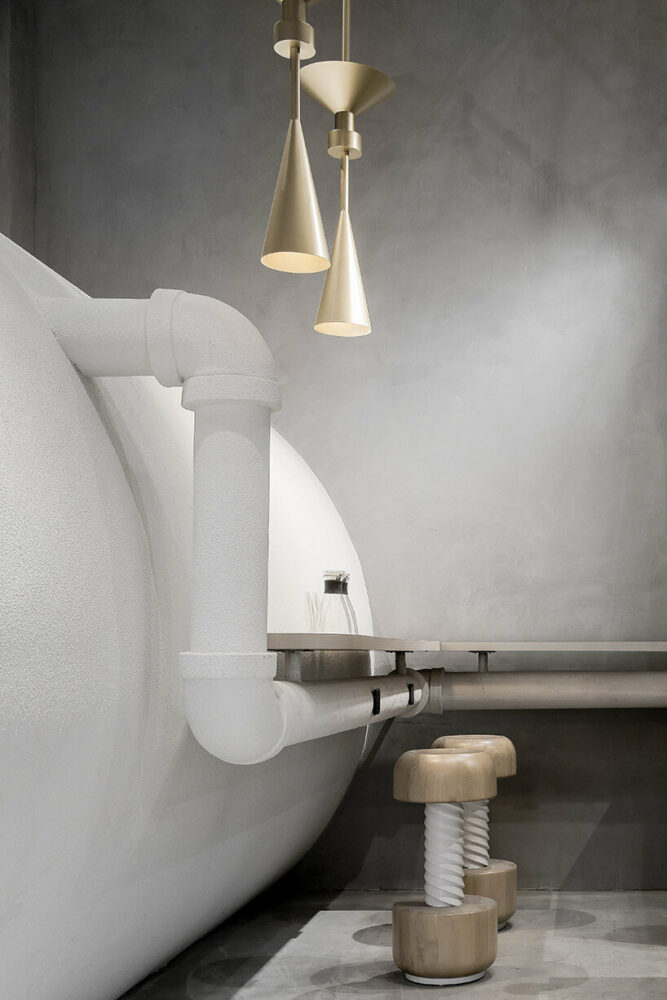 X+Living’s design for the Powerlong Ideas Lab references the factories of the Steam Age, forming compositions of industrial elements that are important to both the visual and functional aspects of the project. The Chinese architects demolished the floor slabs of the original two-story building and transformed it into a single space about nine meters high. The firm then restored the floor area with a minimalist approach and designed a selection of reaction tank rooms, where customers can enjoy a unique shopping experience. In addition to the tanks, the utility lines previously exposed in the space are perfectly concealed in the replica ‘energy delivery pipes’. In parts of the space, the pipes are integrated into a first-floor environment that includes a series of tubular tables and chairs that mimic the shape of the pipes, layering the overall space to create a different composition.