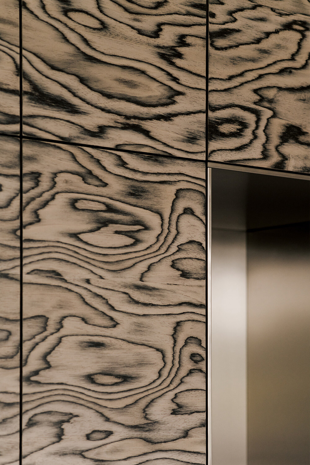 walnut burl, pink terrazzo, and steel combined at the entrance