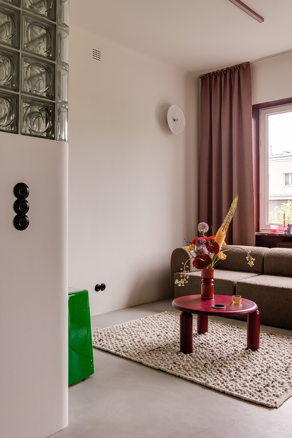 In Praga Północ, a district of Warsaw, Polish interior design studio Mistovia took up the renovation of a 45 square-meter apartment for an art director, Paulina, and her dachshund, Gustaw. The uplifted living spaces belong to the post-war Praga II estate, a building designed by architects Jerzy Gieysztor and Jerzy Kumelowski in the 1950s, following  the spirit of socialist realism. Completed in under five months, the project brings a truly post-modern mix to the post-war setting; Mistovia effectively concocted a Memphis-style atmosphere with strong textures, design classics, unique color tones and materials, vintage furniture, and tailor-made pieces. ‘Paulina was very open to bold ideas,’ notes Mistovia studio founder Marcin Czopek.