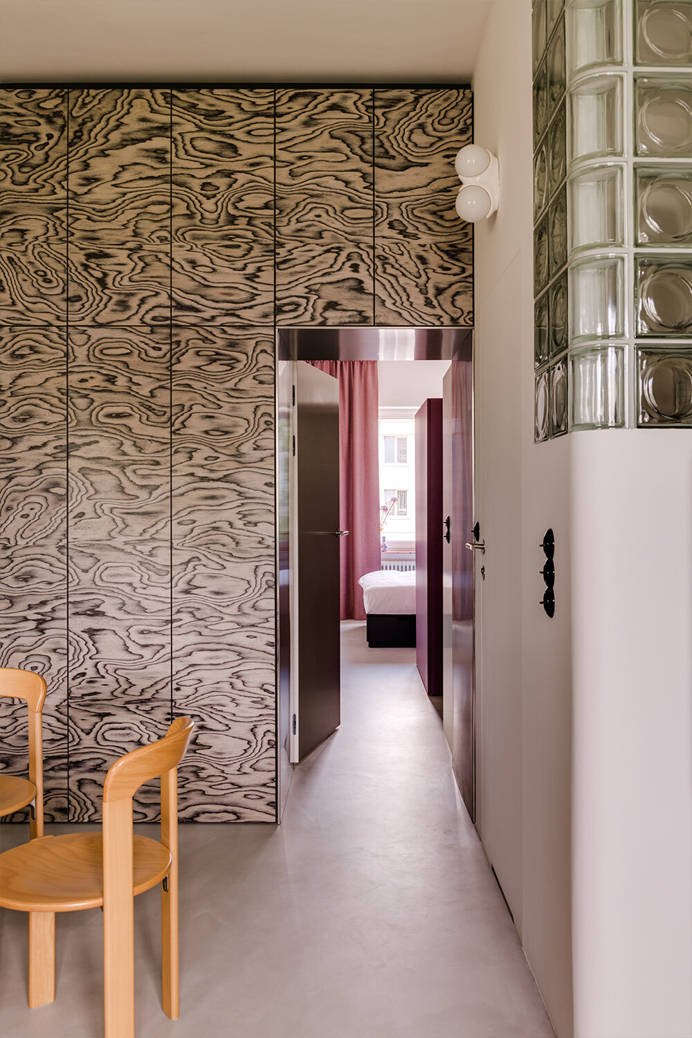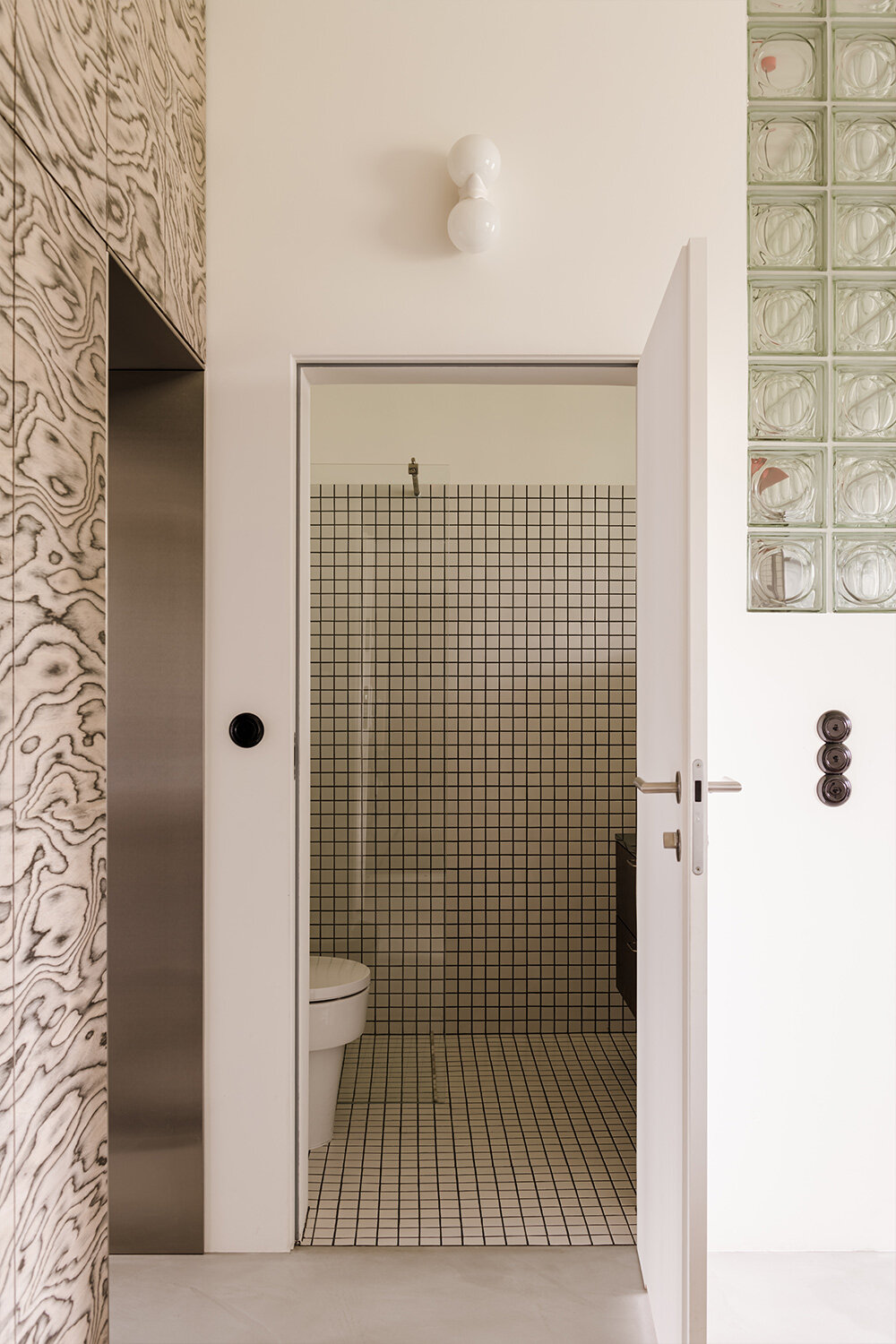 The renovated Praga apartment by Mistovia (see more here) did not undergo extensive layout changes; instead, the team followed a program dictated by several dominant ‘cubes’, each holding a specific function accentuated using various patterns of veneer or color. This playful puzzle of bold accents and geometric forms is met by a neutral and uniform backdrop of white walls and light gray micro cement floors. Stainless steel, veneer, and glass bricks also figured on the owner’s wish list, which Mistovia readily incorporated throughout the space. Despite its modest size, the apartment’s high-ceiling rooms helped brighten the design.
