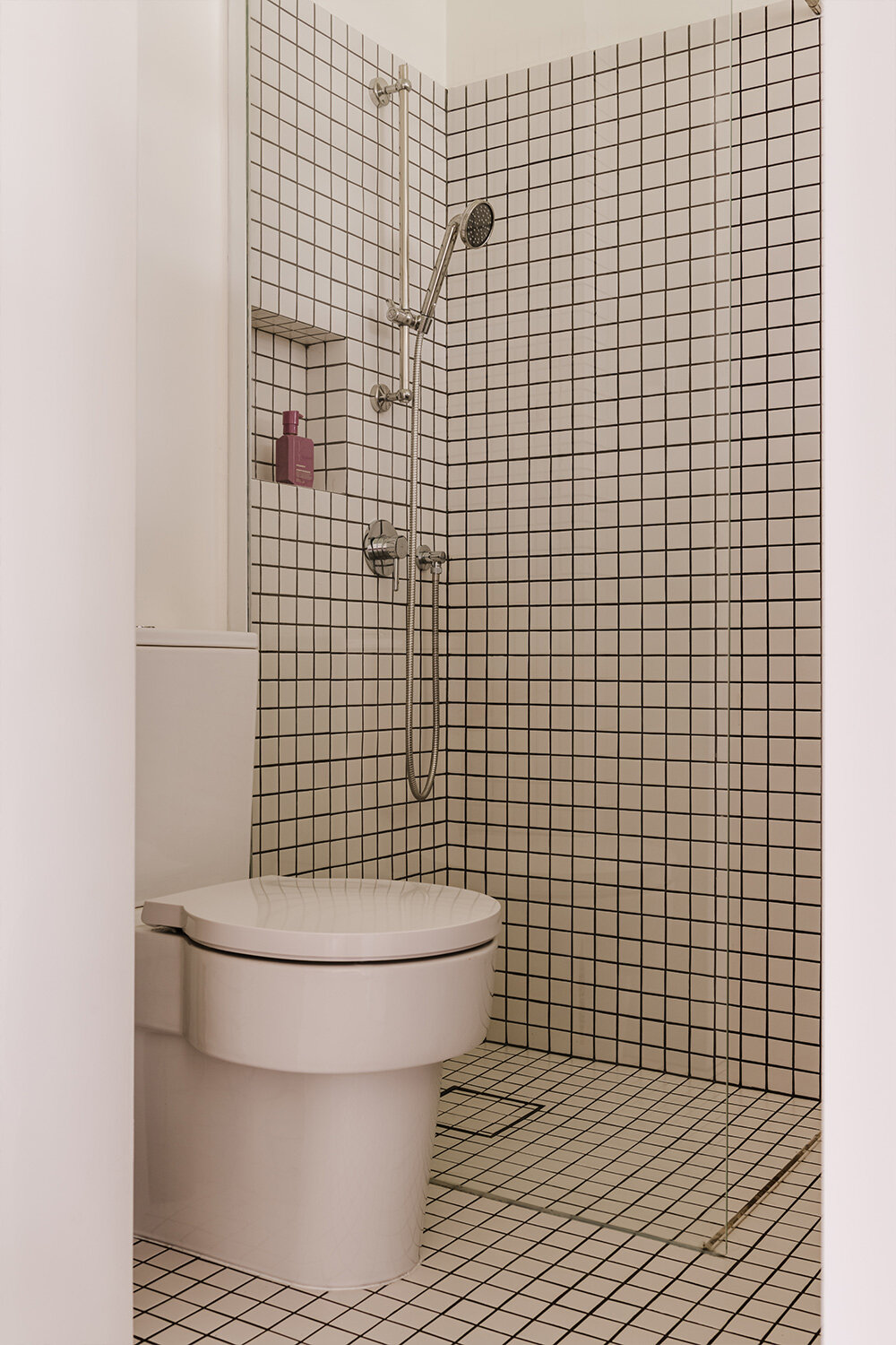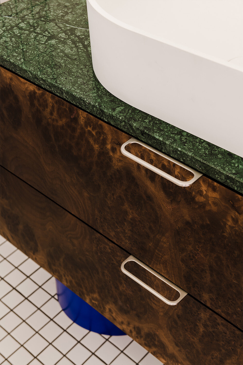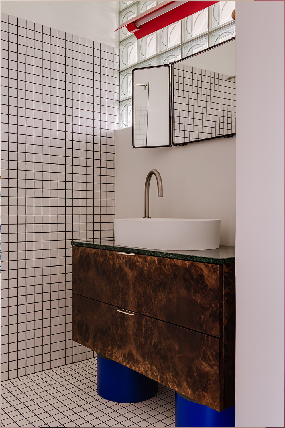 A small bathroom constitutes the last element of this elaborate puzzle, reduced to the necessary minimum while still showing off unconventional solutions. Following Paulina’s material request, a curved wall made of glass bricks allows sunlight to filter in, brightening this previously dark room. A custom-designed bathroom cabinet shaped like a chest of drawers on squat legs in an intense shade of cobalt stands out against the raw pool tiles chosen by designers from Mistovia. At a closer look, one could notice that the cabinet features the same veneer as the built-in furniture in the kitchen and that the countertop holds the same green marble adorning the front door’s portal. Completing the post-modernist bathroom is a pink lamp by Polish brand Lexavala and 3D mirror panes reflecting and multiplying bold patterns at different angles.